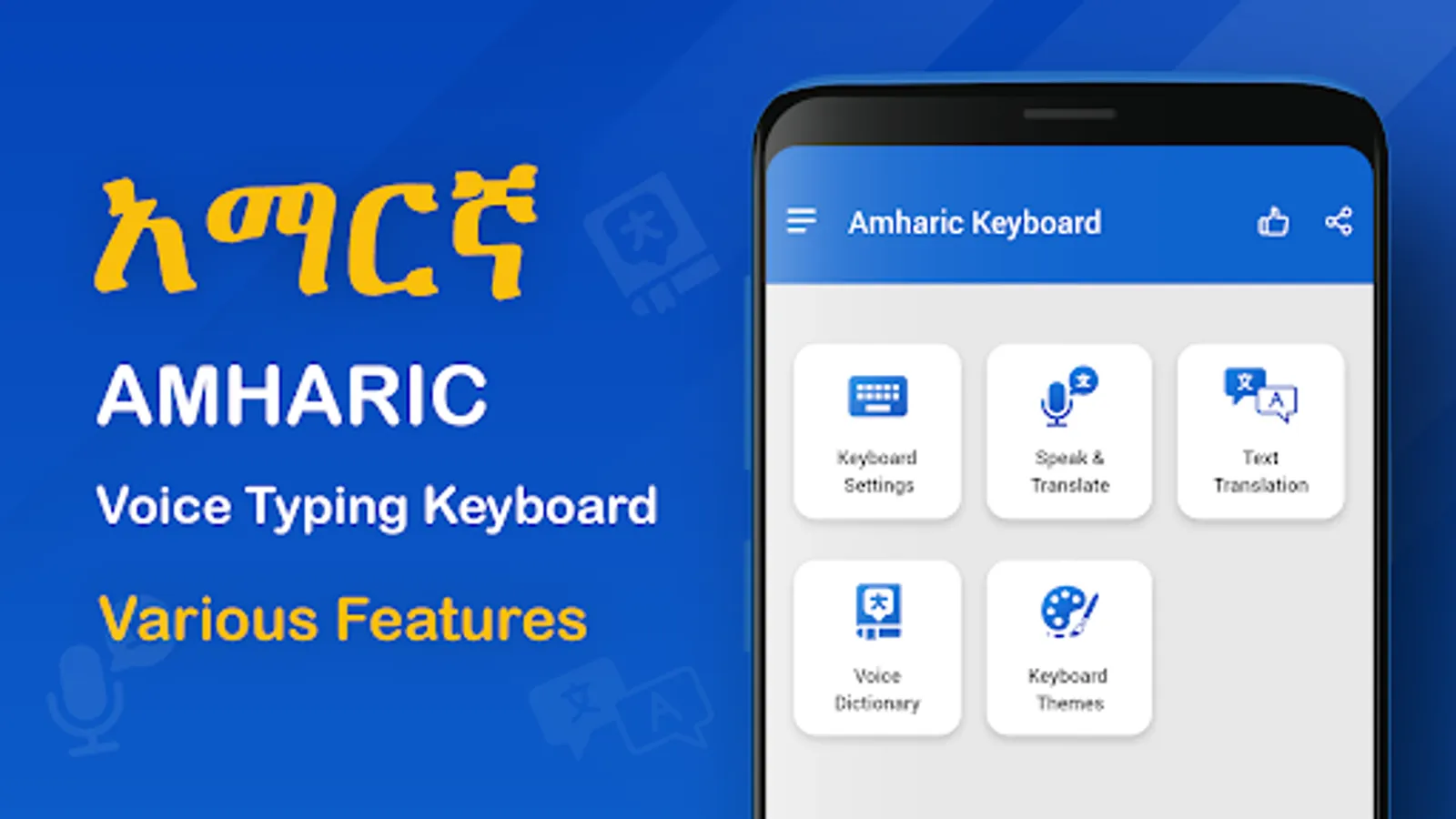 Amharic Voice typing Keyboard helps you to read and write Amharic Alphabet, and words. You can speak and translate words with the help of Speech to text feature of this Amharic keyboard. Users can Enable keyboard with just one click. Amharic Voice Keyboard is mostly used in Ethiopia.