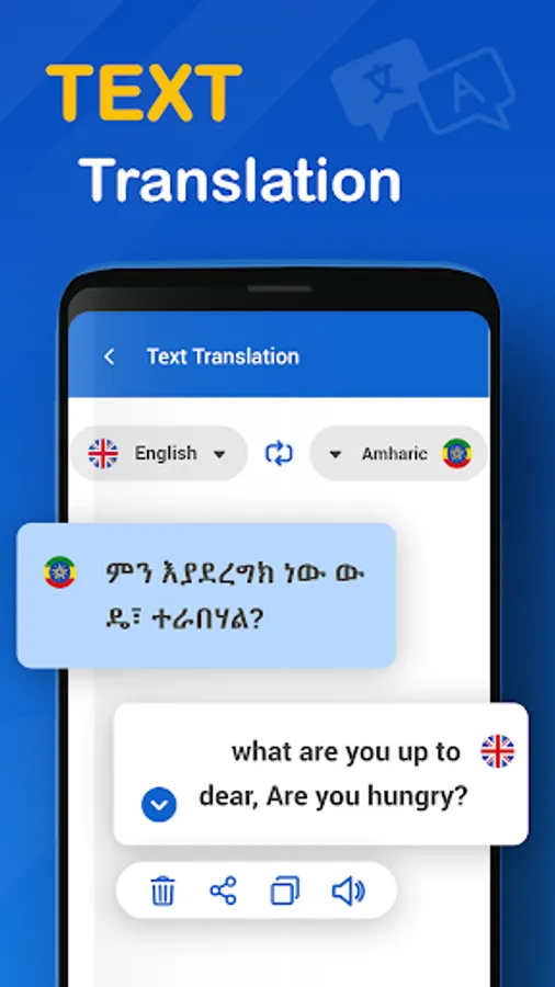 Amharic translator (traductor) converts Speech to text. Text to Speech (TTS) feature of this English to Amharic keyboard app will help users to type and speak the desired words. Users can write and translate sentences with the help of a text translator. Audio to Text Amharic keyboard uses Speech recognition and Speech to Text functionality of the device.