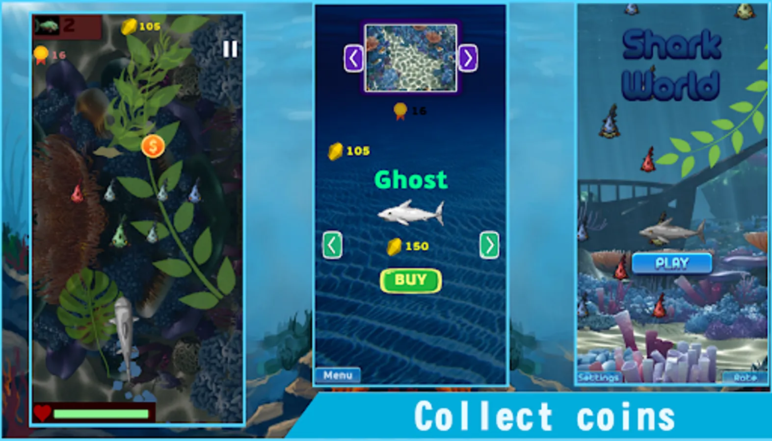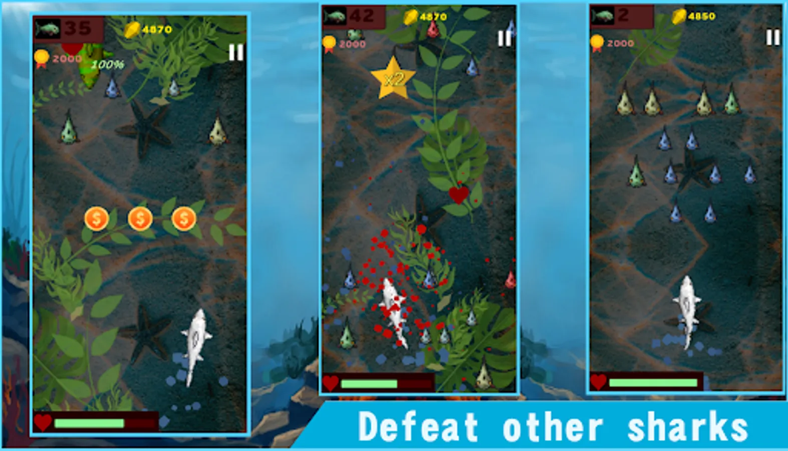 Try to be a shark in different locations, fight against other sharks and eat all the fishes. Scroll finger to move your shark and eat all fishes in your way. Collect coins and other items like hearts and stars. Use collected coins to buy new sharks, the more shark cost - the more powerful it is. Set high records by eating fish and defeating other sharks so you will be able to open new maps. There are a lot of different and cool maps where you can try to survive.