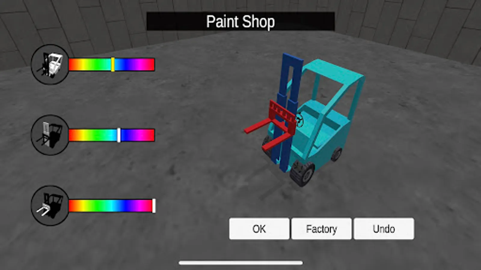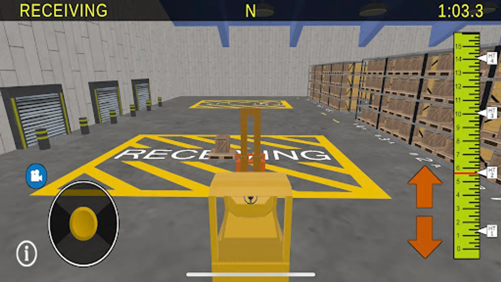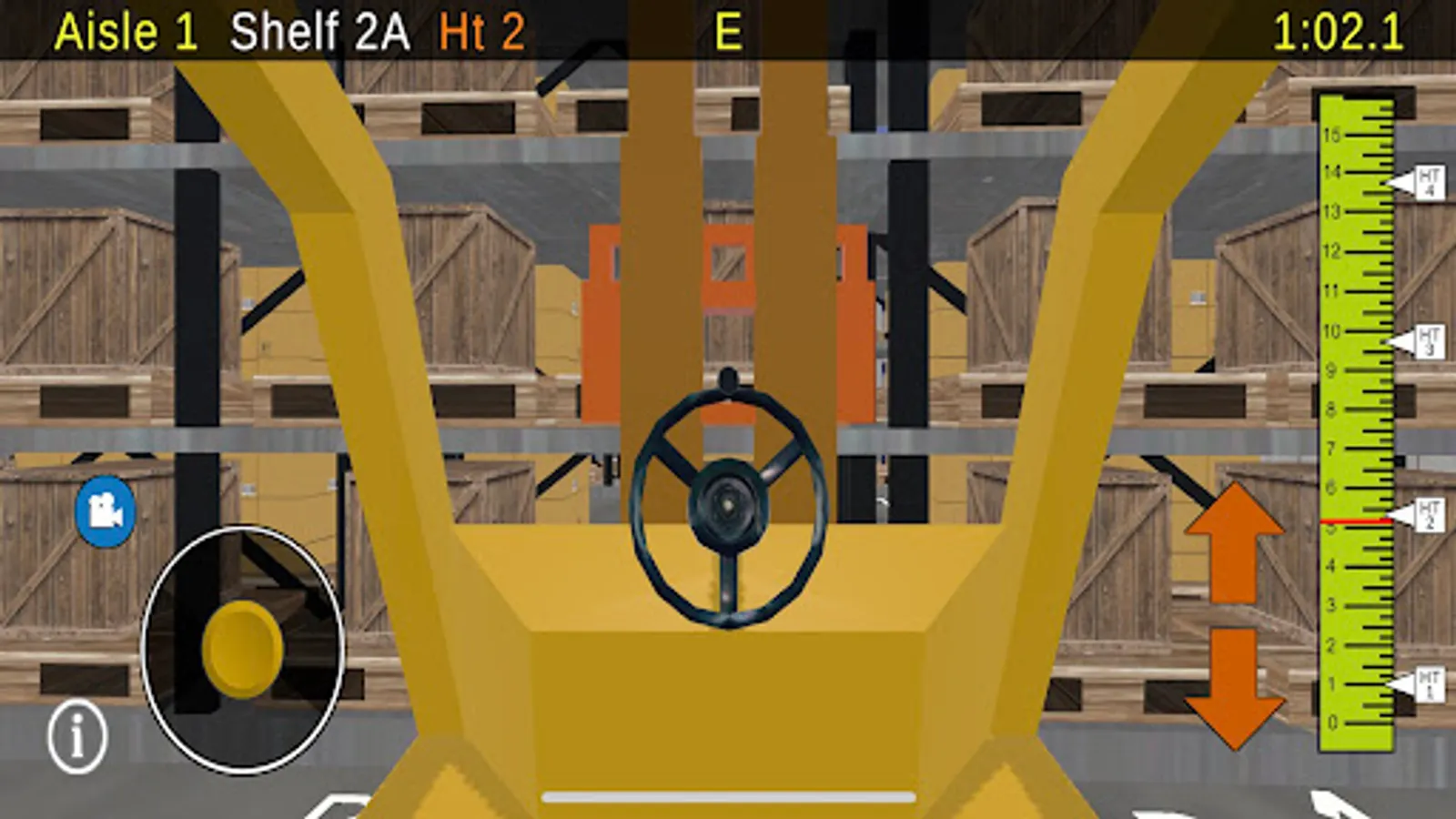 Simple intuitive controls: Use joystick to steer forklift. Use onscreen up / down arrows to raise / lower fork.