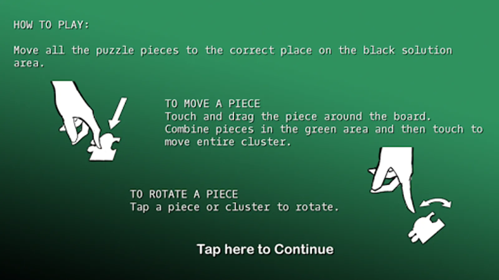 Cut up a photo image into several different jigsaw puzzles ranging from 30 to over 500 pieces. Number of pieces depends on the resolution of your device and the photo itself.