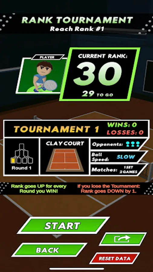 - Rank Tournament - compete against AI opponents to work your way up to top #1 ranking.