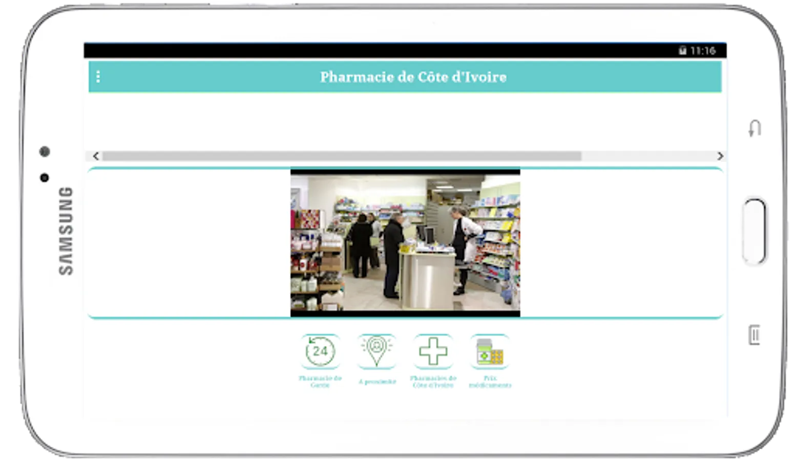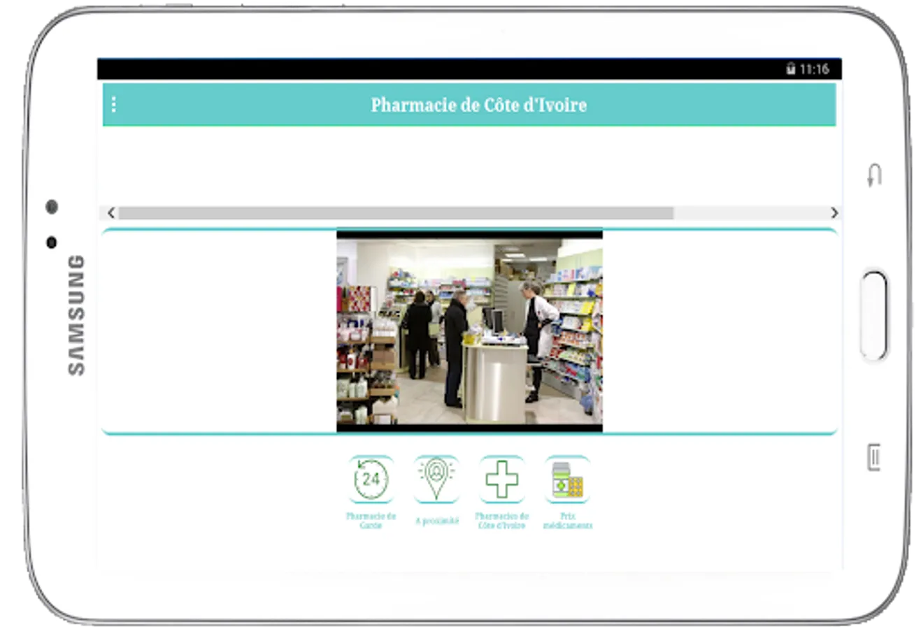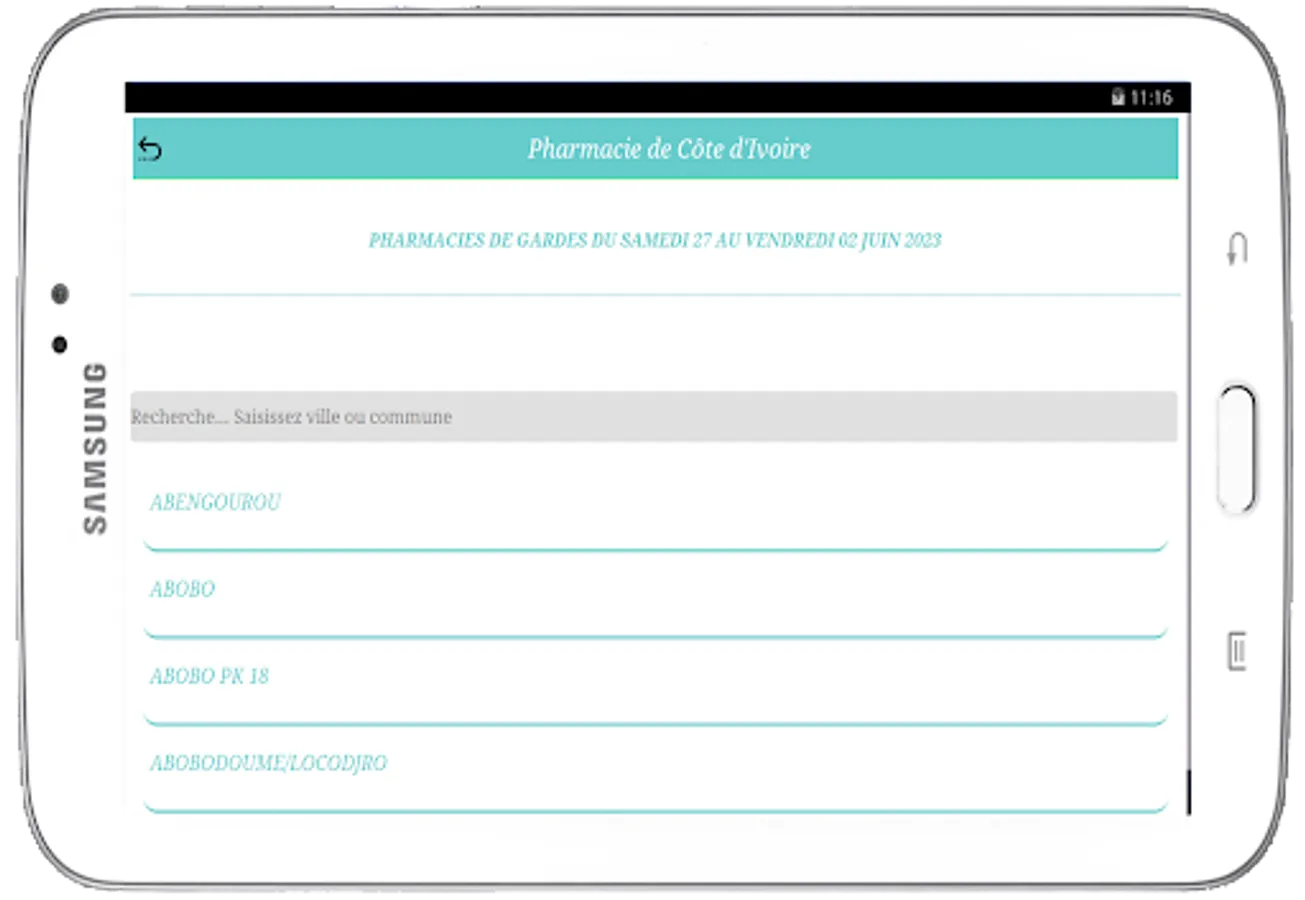 The Ivory Coast Pharmacy application is an application that allows you to have all the pharmacies of the Ivory Coast, to consult in real time all the pharmacies on duty and to geolocate the pharmacies.
