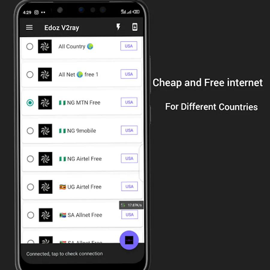 With Edoz V2ray accessing cheap and free internet has been made easy, with the inbuilt free internet settings for different countries and ISPs and networks.