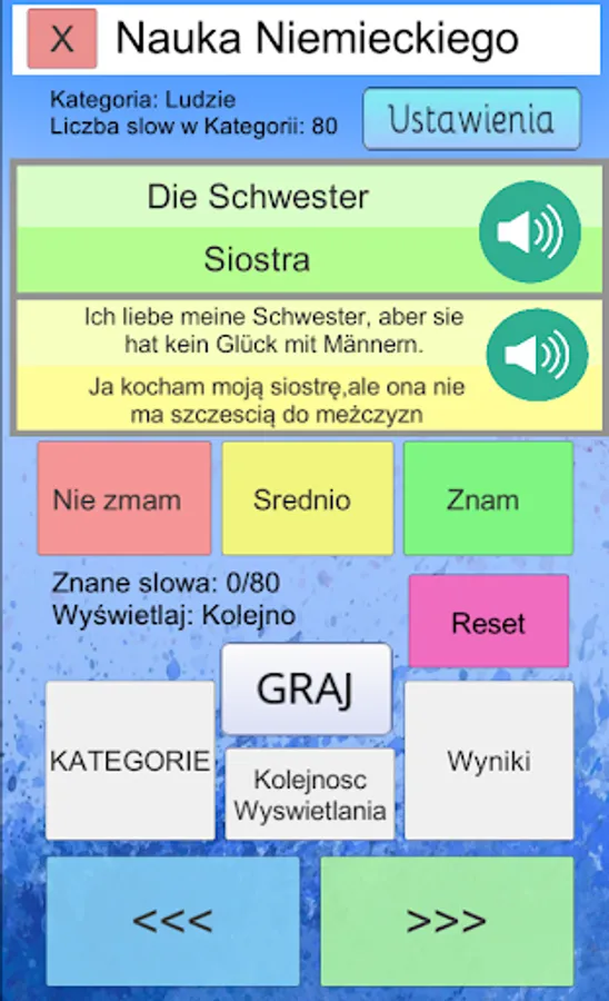 The application is used to learn German words. The application is divided into 2 parts, the first strictly educational to learn words. The second part of the application is an interactive game in which we can demonstrate knowledge of previously learned words. Currently over 1,000 words translated in 30 categories, Edu Angry Fish, Learn German, and Flashcards