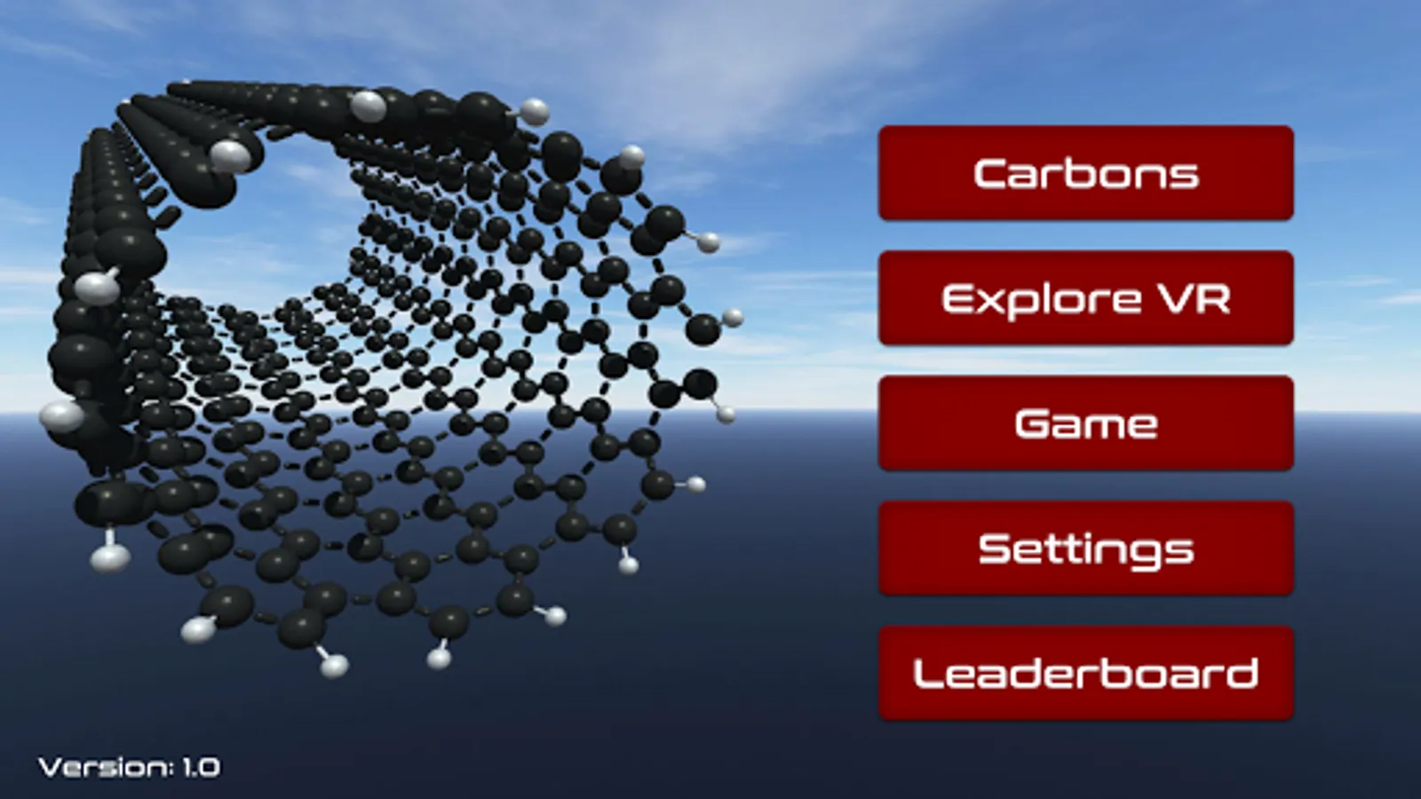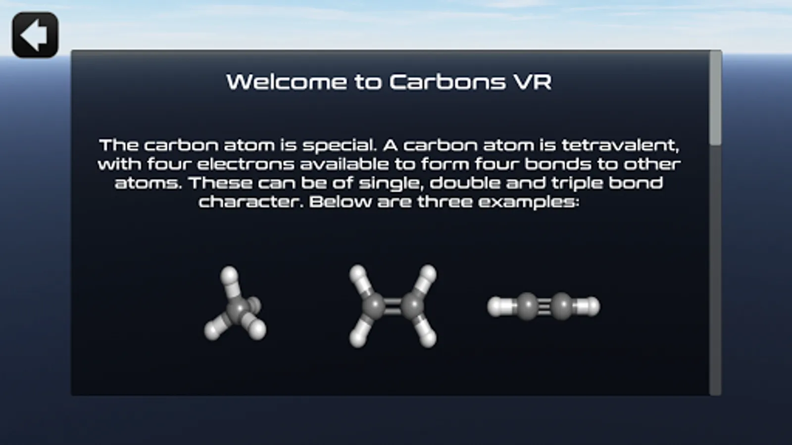 Learning Carbons VR is an educational virtual reality (VR) app where students can learn about the various forms of carbon. We, EduChem VR (http://educhem-vr.com), create immersive virtual worlds of atoms and molecules to explain their 3D shape and electrostatics. You can learn chemistry while playing. Chemistry lends itself to 3D and virtual reality since all chemicals are 3D objects. It has been shown that one very efficient way to learn more and deeper about abstract things like atoms and molecules are by VR. Play "Learning Carbons VR" - it is fun, cool and educational. There’s an associated kahoot quiz here: https://play.kahoot.it/#/k/1b55c806-1641-4f03-9236-0fb292cc24df