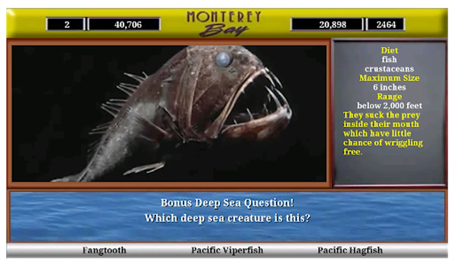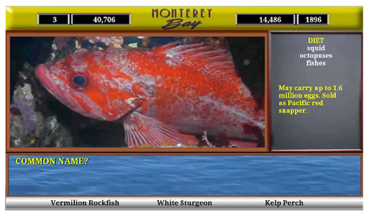 How familiar are you with the sea life in Monterey Bay? Featuring over 200 species, take this challenge in a fun and entertaining way! You will be presented with 5 random sea creatures seen in the bay. Select the best choice at the bottom of the screen for each of the 5 categories: Common Name, Classification, Habitat, Longevity and Maximum Size. The timer reflects your score, so speed counts!