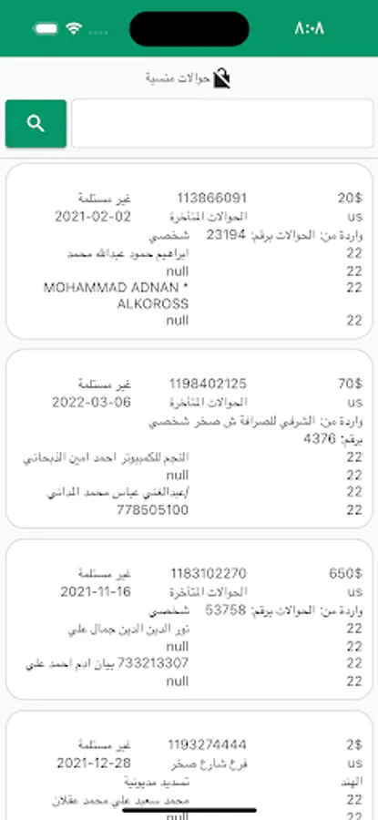 The first application in Yemen for forgotten transfers The application works to display all forgotten transfers to all exchange companies in Yemen and as a first stage (the forgotten transfers of Al-Imtiaz and Al-Nasser Company) and the beneficiaries of the application are all people so that you can search for the transfer by the transfer number, the name of the sender or the recipient, or the mobile of the sender or recipient There are many options for searching for the transfer, and all the details of the transfer are displayed.