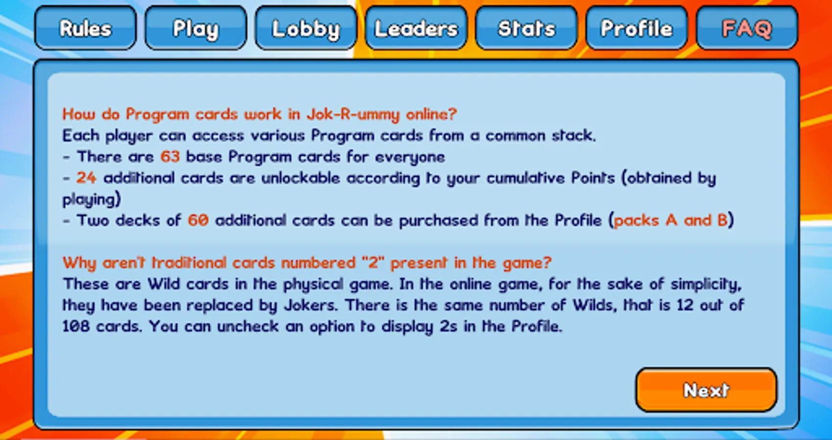 In this rummy style game, you make runs, 4-of-a-kind and many other combinations with your cards in hand! Try to complete the secret Program card (mission) that was assigned to you. Opponents are trying to do the same! Whoever accomplishes 5 Program cards first wins the game.