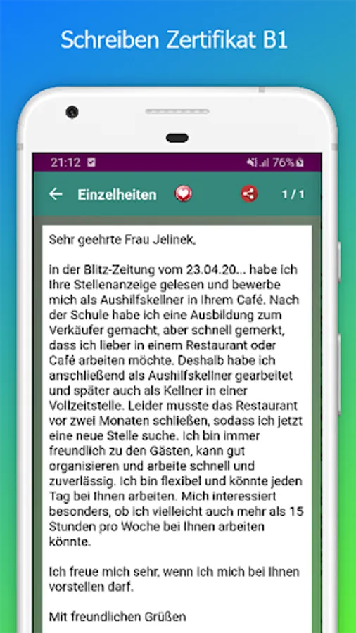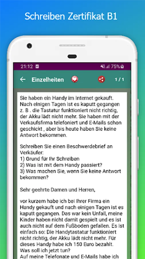 This app aims to help students who have already completed a "German Integration Course" with the DTZ A1-B1 degree and are currently starting a B2 course. It is about the written expression in the area of B2, which can easily be acquired through placement exercises in letters with important everyday topics. The present, revised edition also offers grammatical exercises as well as new letters on current examination topics.