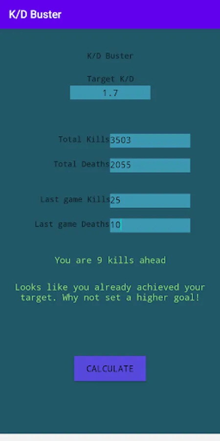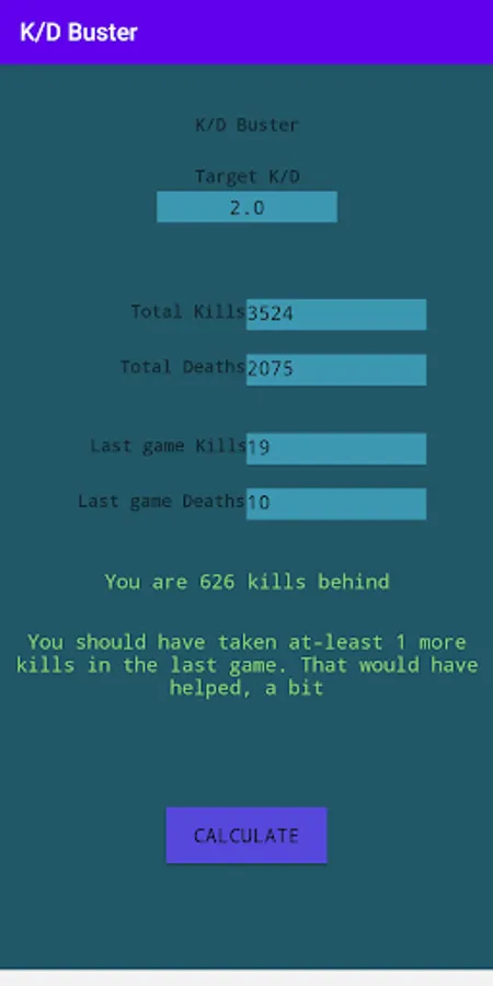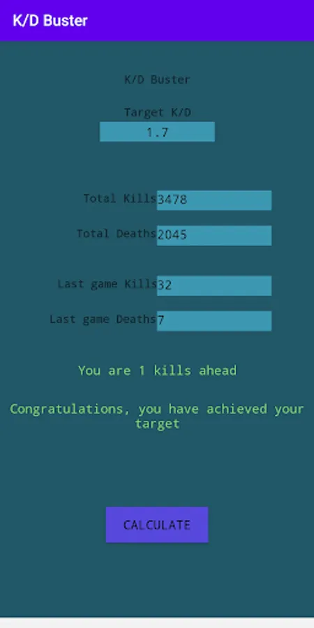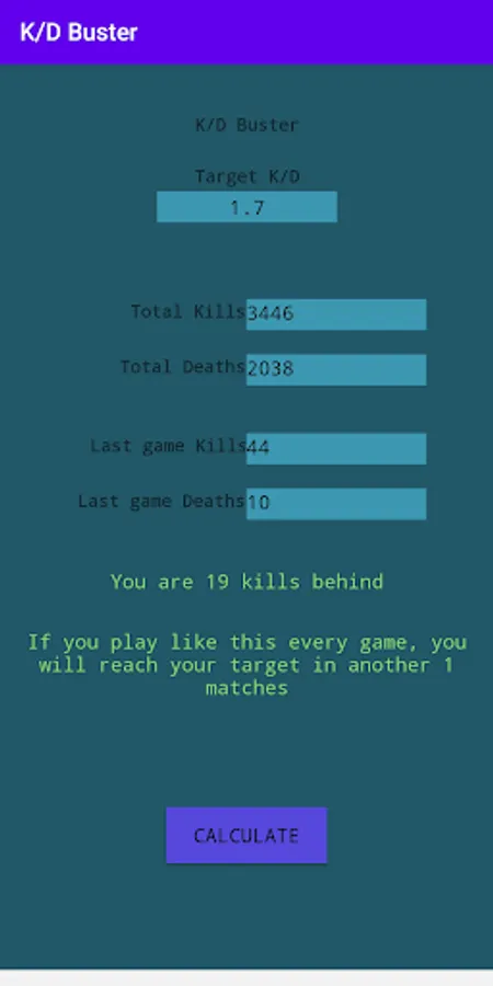 This app will help you keep track of your progress toward your target KDR. It says how many kills away are you from your target. It can also, approximately and occasionally predict the below:
