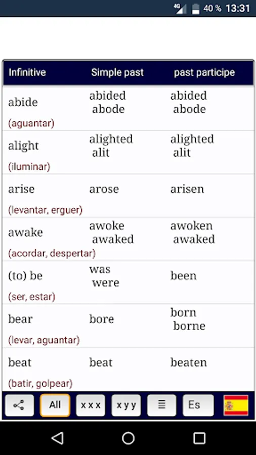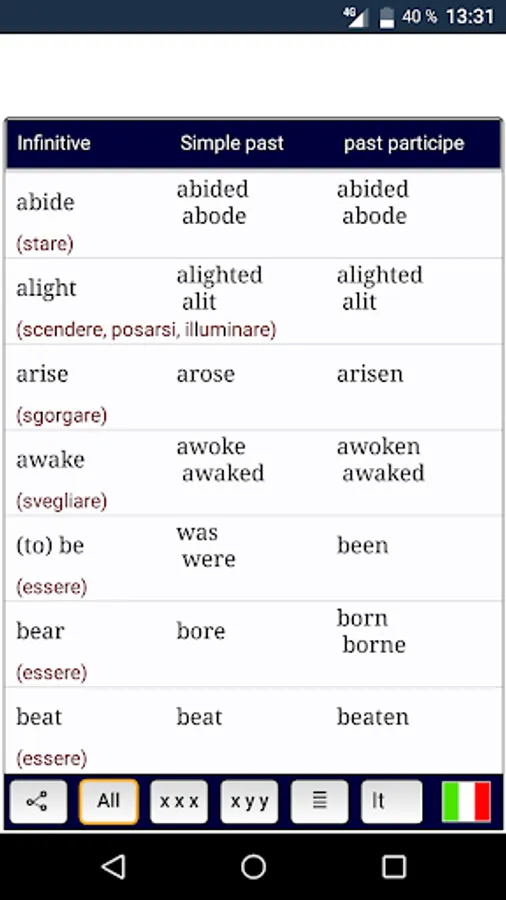 205 irregular verbs with translation into French,, spanish, german, and italy. Pronunciation (voice) is done by artificial intelligence.