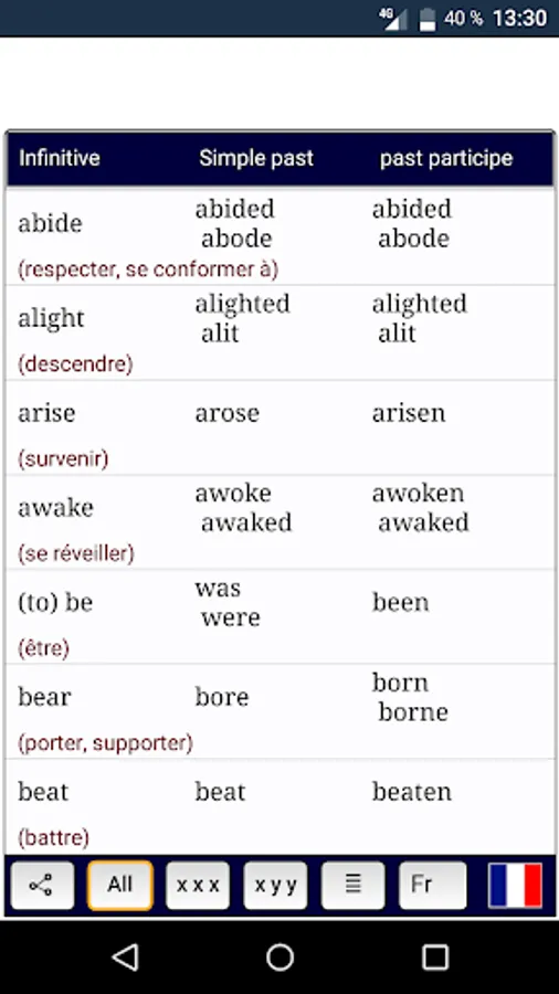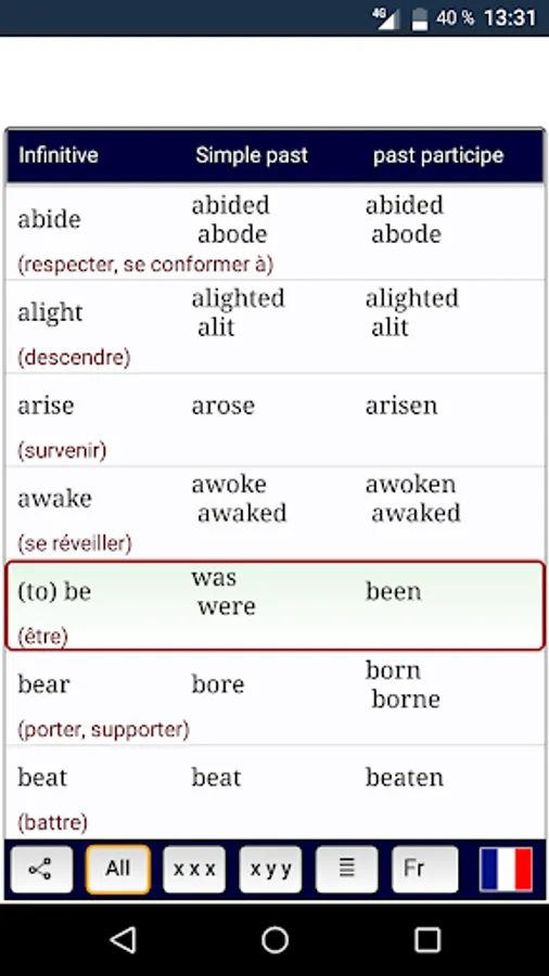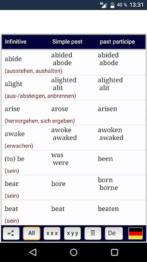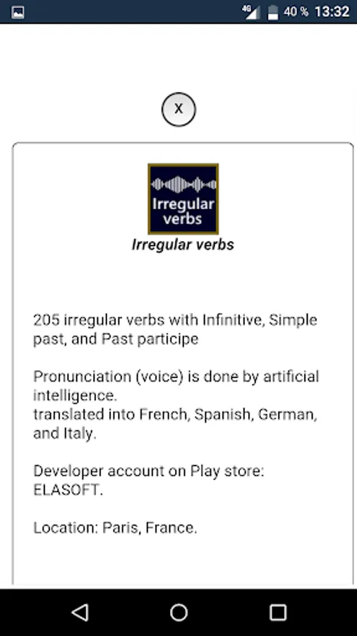 205 irregular verbs with translation into French, Spanish, German, and Italian. Pronunciation (voice) is done by artificial intelligence.