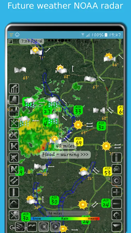 The storm radar app calculates a one-hour prediction of rain and snow in five-minute frames. NOAA radar has a six-hour weather radar history.