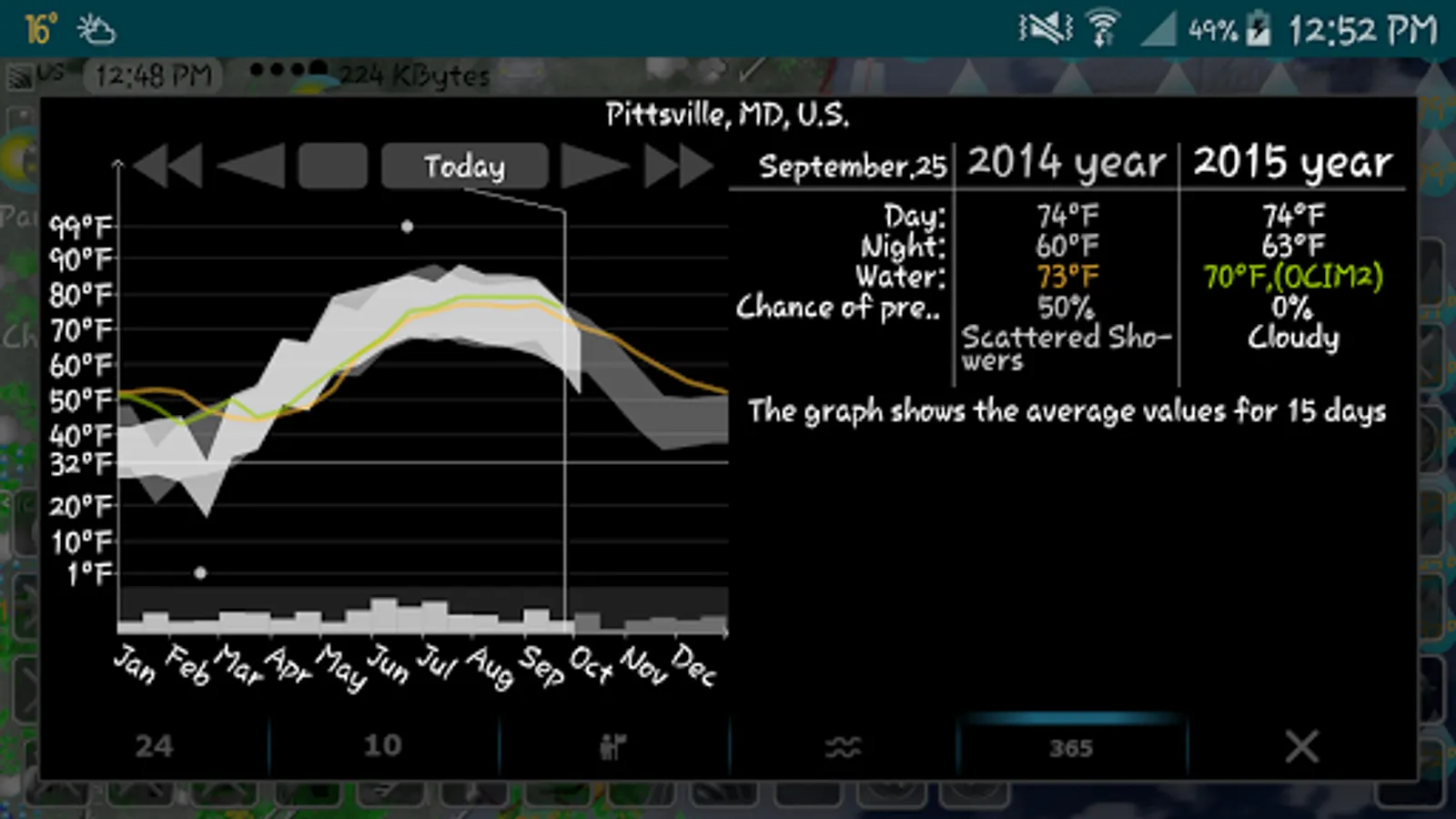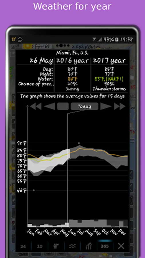 With the Doppler radar app, you can long-click on any location on the map and see the weather at that location with the archive for the last few years. The archive includes sea and air temperature, precipitation and cloud cover. Travel weather helps you choose the right time and place for your upcoming trip and compare temperatures and precipitation between this year and past years.