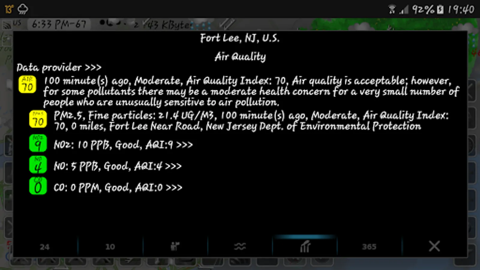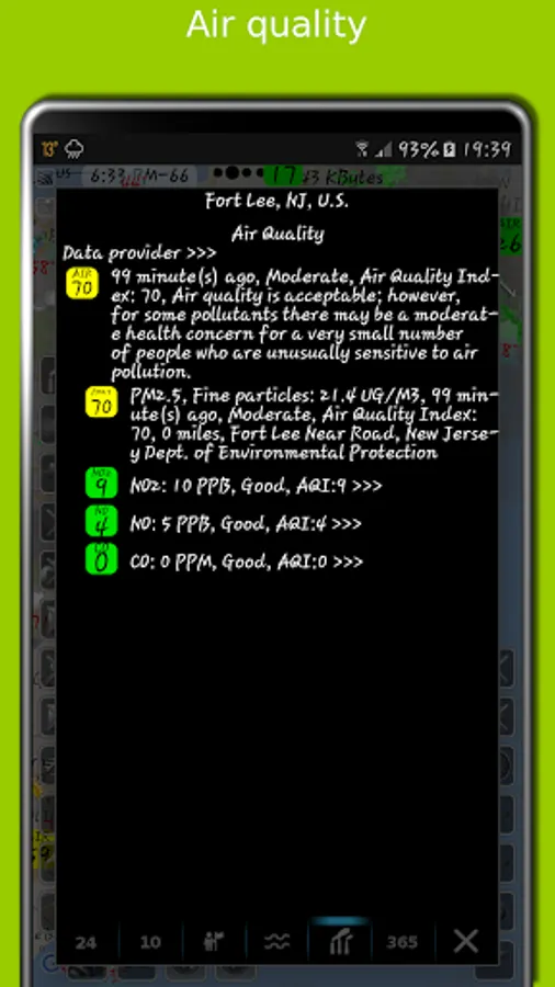 The air quality app includes concentrations of ozone (O3), fine (PM25) and coarse (PM10), particulate matter, dioxide (NO2) and nitrogen oxide (NO), carbon monoxide (CO), etc. from various sources: AirNow, Copernicus, ECMWF, etc.