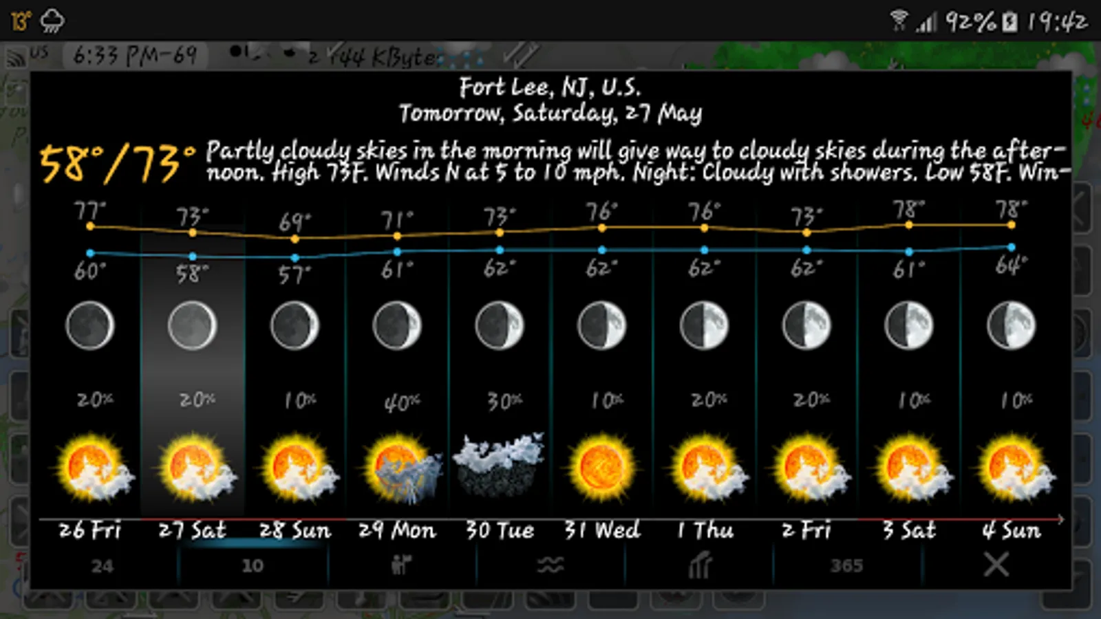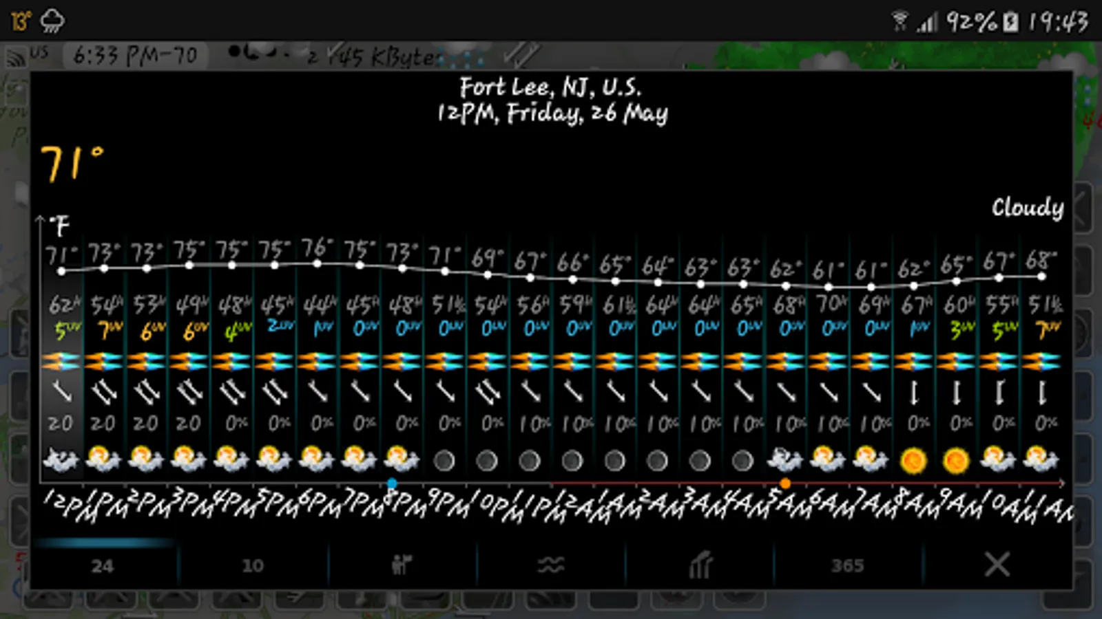 If you click on the "CC" button and toggle to "10" or "24", you can view a 10-day or 24-hour forecast directly on the map.