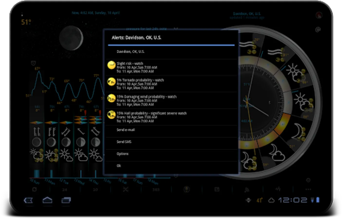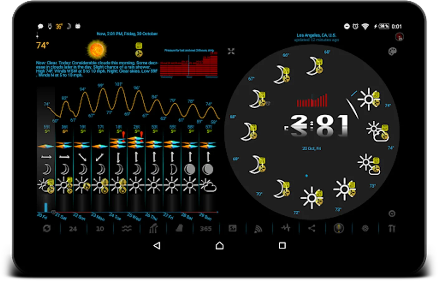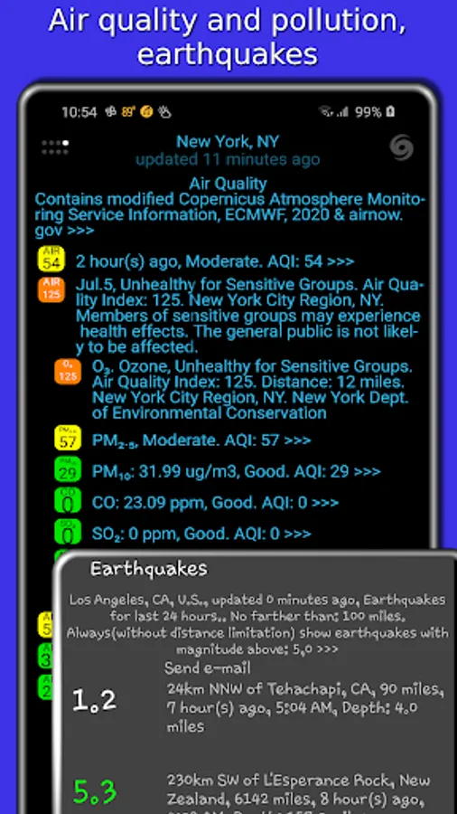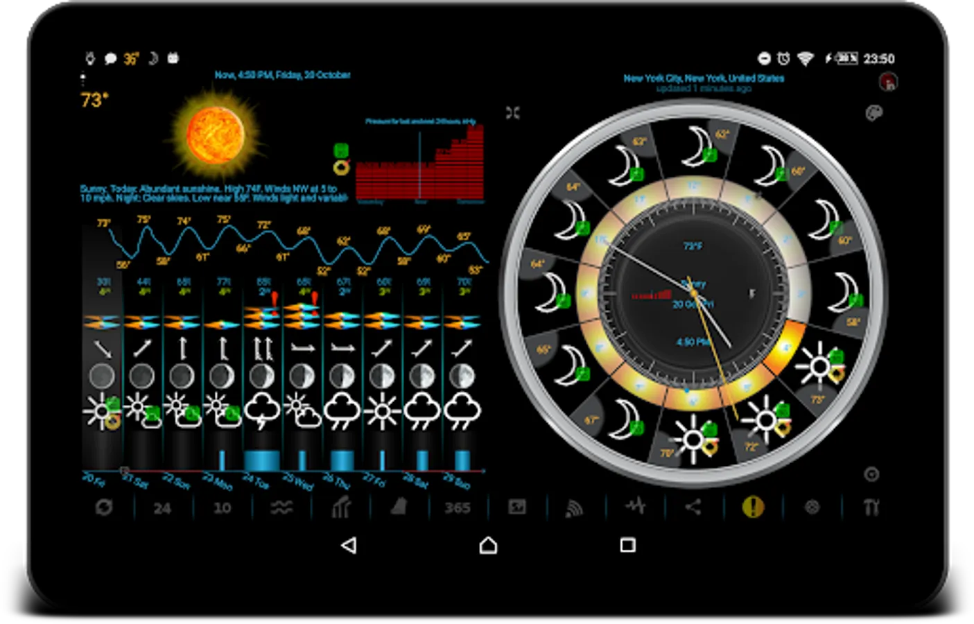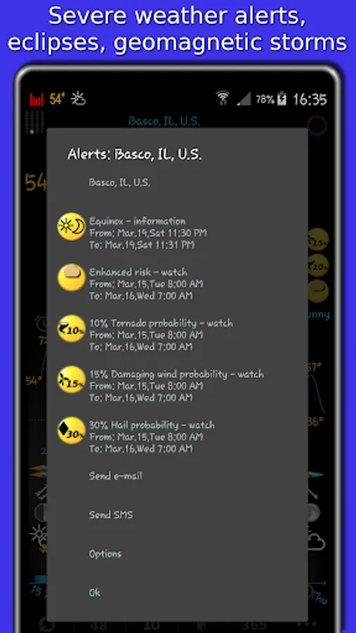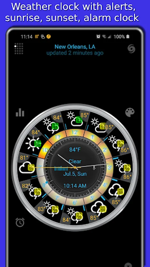 Our app displays icons for temperature, precipitation, and barometric pressure in the status bar. You can add notifications for wind, earthquake, humidity, UV index, geomagnetic storm, moon phase filtered by low or high threshold, etc.