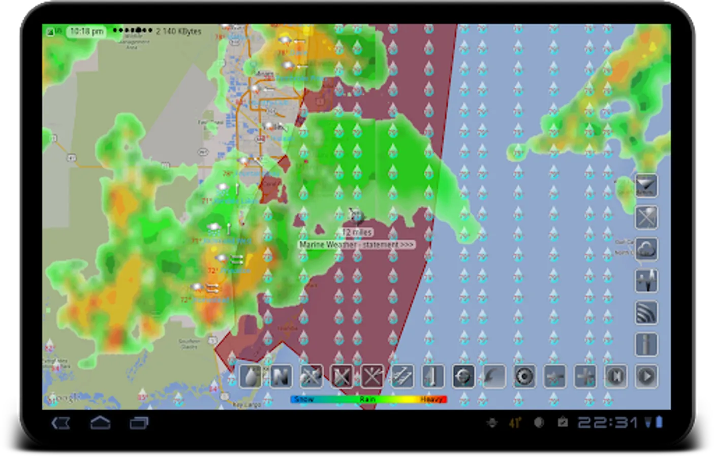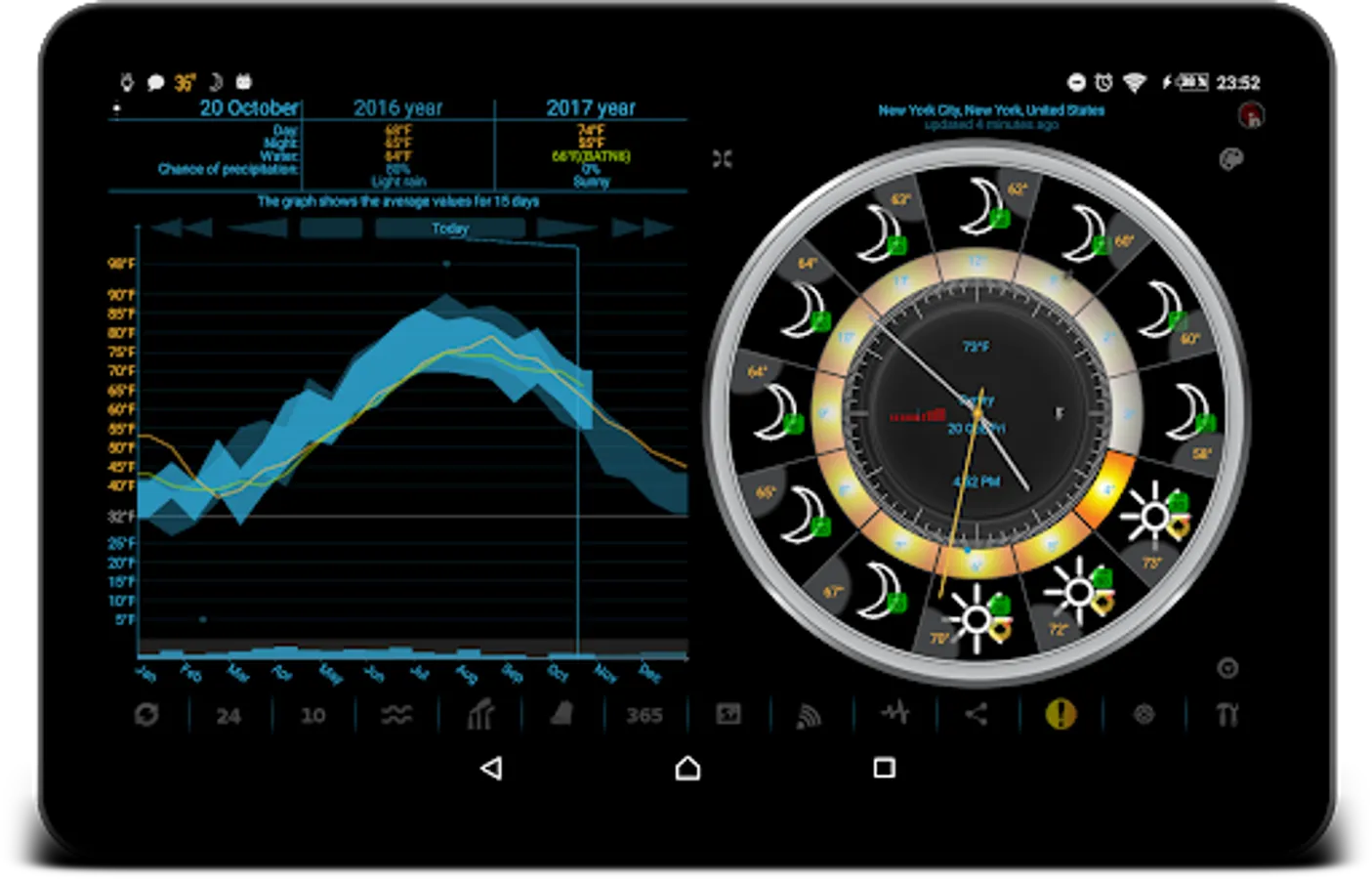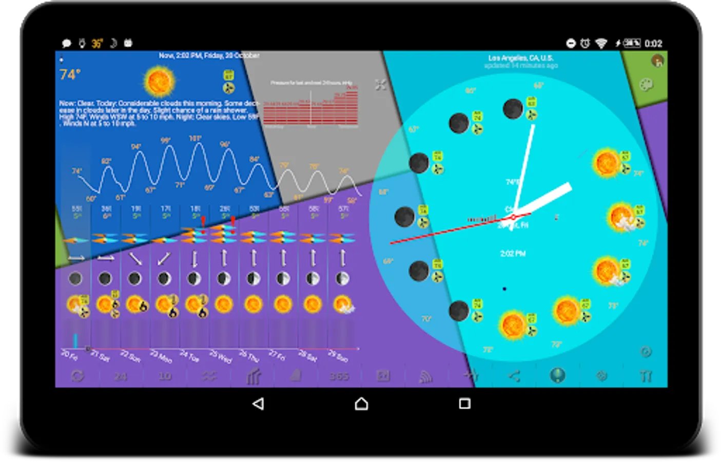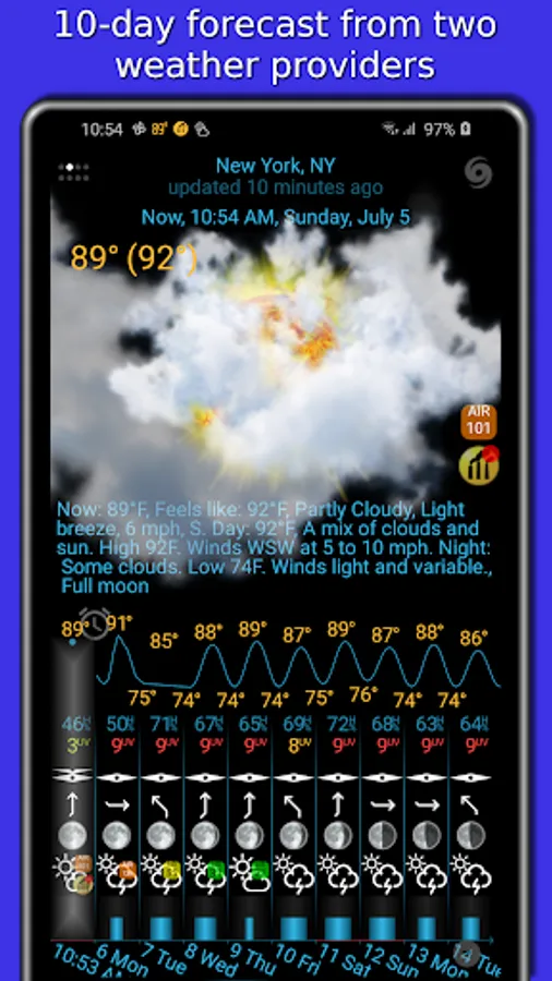 Our app displays icons for temperature, precipitation, and barometric pressure in the status bar. You can add notifications for wind, earthquake, humidity, UV index, geomagnetic storm, moon phase filtered by low or high threshold, etc.