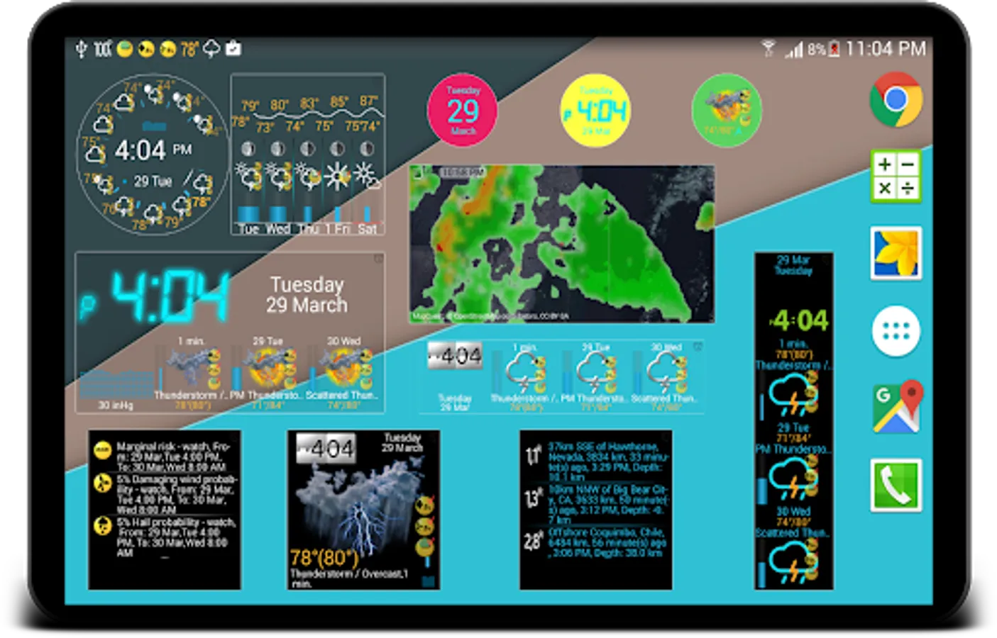 Unique widgets include weather clock, storm radar, sun and moon, pressure, alerts, moon phase, earthquake etc.
