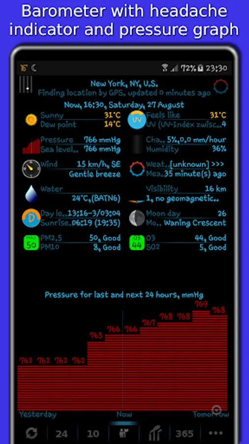 Barometer shows both atmospheric pressure and sea level pressure. Barometric pressure tracker informs you about pressure changes in the past and future 24 hours. Rising pressure leads to the sun. Pressure drop leads to rain.