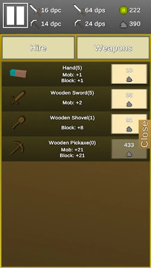 Tap to kill mobs and blocks. Earn xp and blocks to buy tools upgrades and hire new friends.