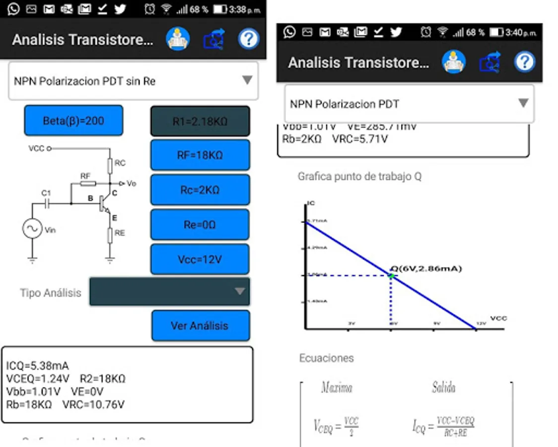 • Analysis of BJT transistors (PDT polarization, Maximum output excursion, Fixed Polarization, Collector feedback, work point graph Q)