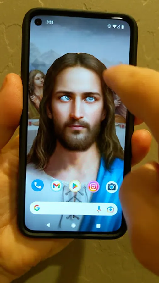 • Jesus Sees - This is a 3D live Jesus wallpaper that shows Jesus at the last supper. The perspective changes when you move the phone and Jesus' eyes gaze upon your finger whenever you touch the screen.