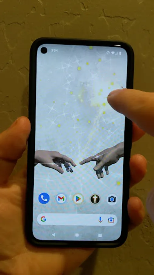 • Creation of Adam - This live God wallpaper looks like the hands of God and Adam as painted by Michelangelo. It has a particle effect showing the light of God and changes perspective with the movement of the phone. It also shoots a beam of light from the finger of God to yours whenever you touch the screen.