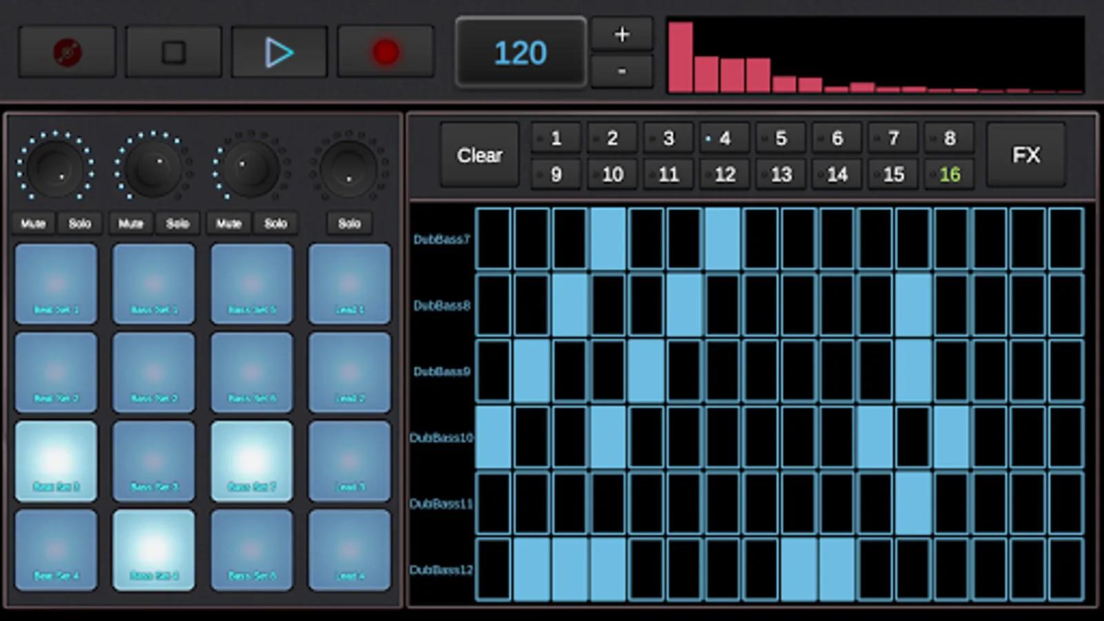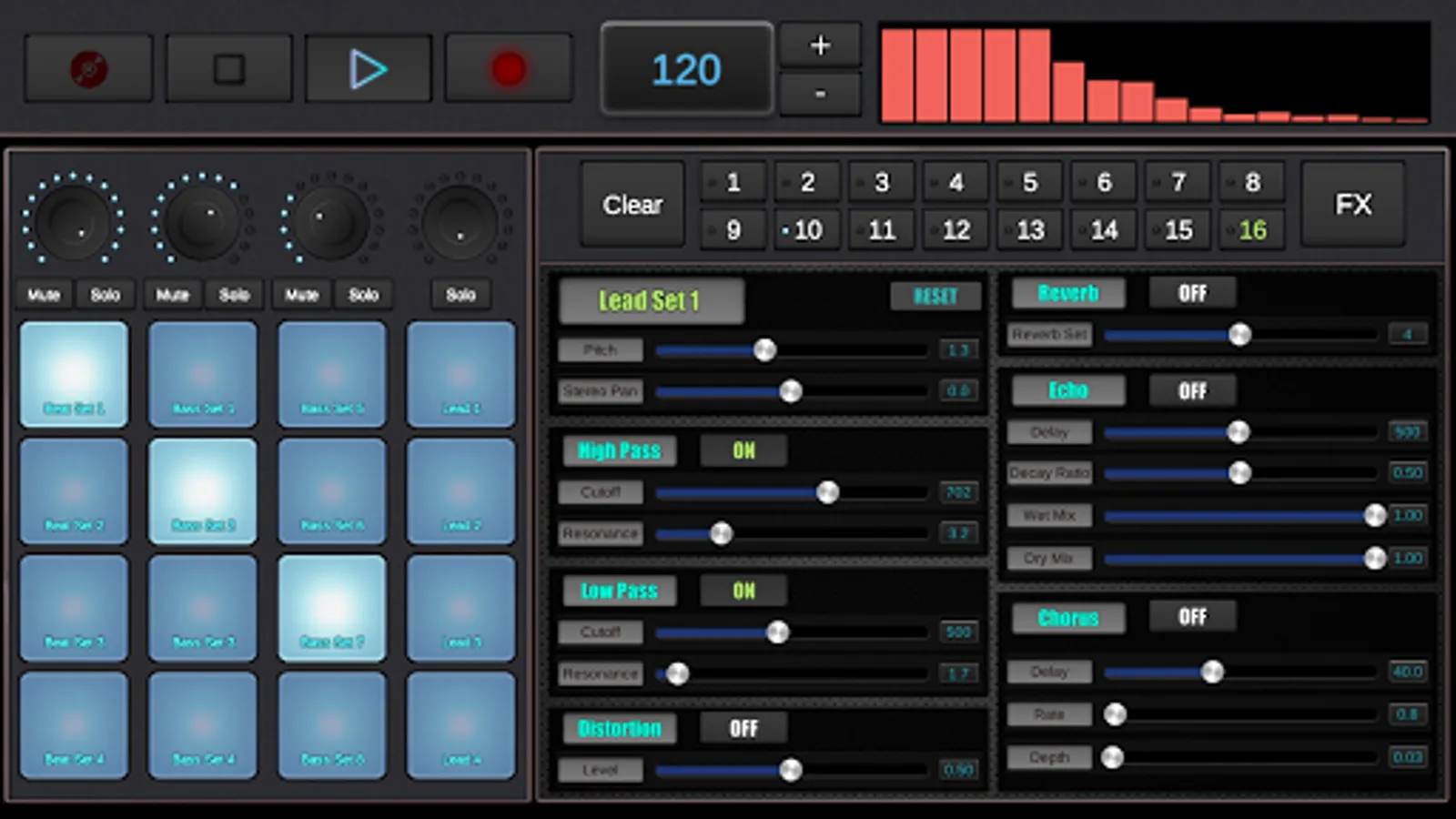In DubStep Song Maker, we provide great sound filters and FX to make your music even better. We have Echo, Low pass, High pass, Reverb, Distortion, Chorus, and Pitch.