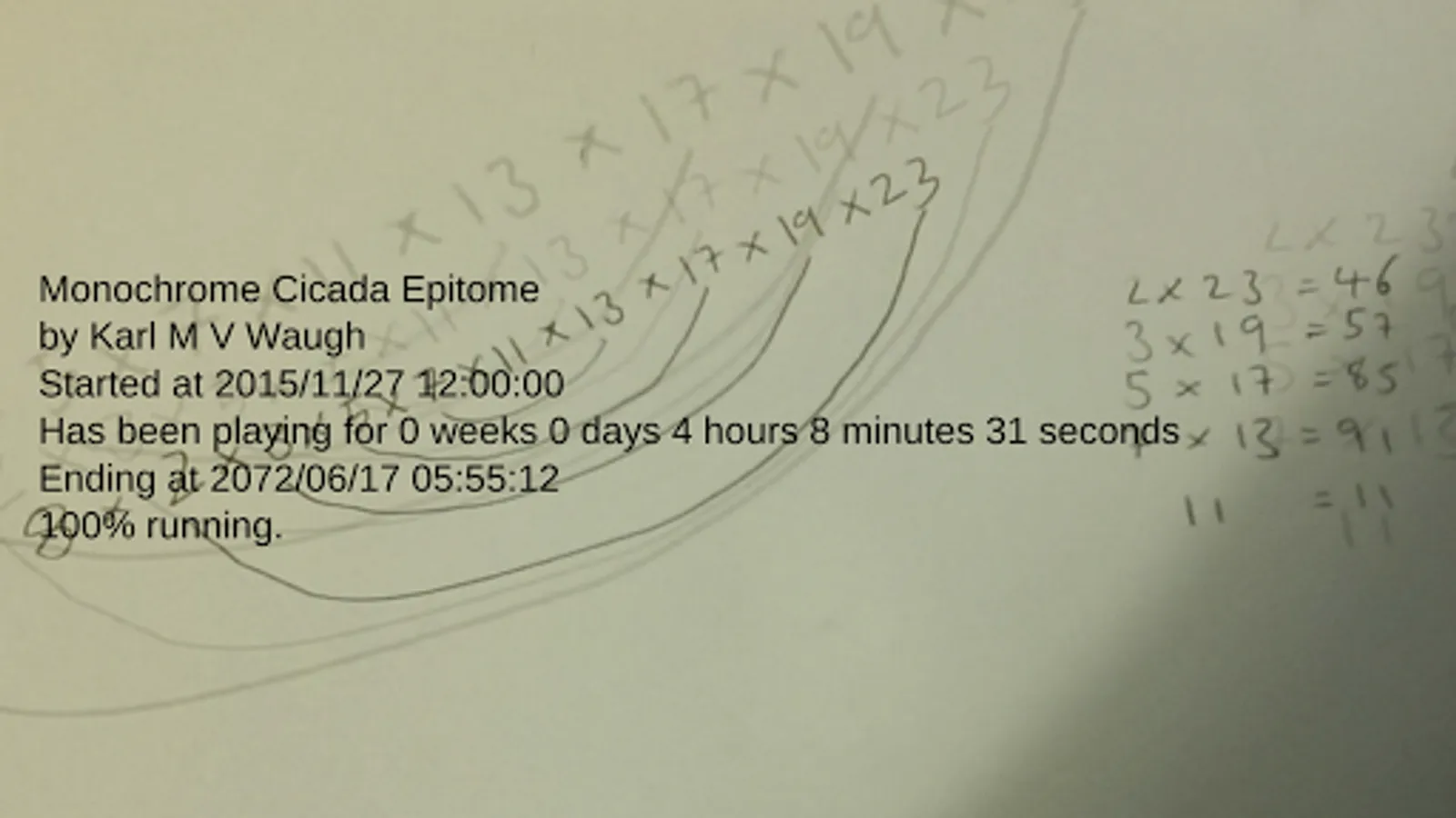 A piece of music lasting for over 56 years, Monochrome Cicada Epitome has been created so that if you open the app at any point within the next 56 years the piece will catch up to where you would be. This is done by various parts 'entering' over a few minutes. A counter shows you what percentage of the total piece is currently playing, once at 100% then the piece is playing as it should.