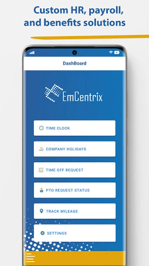 EmCentrix's mobile app for smartphones allows employees to punch in and out, track mileage, view time off requests, and check their company holidays on the go. Because employees use their existing user accounts from the online HR system, employers can control which of their employees are allowed to use the mobile app's functions.