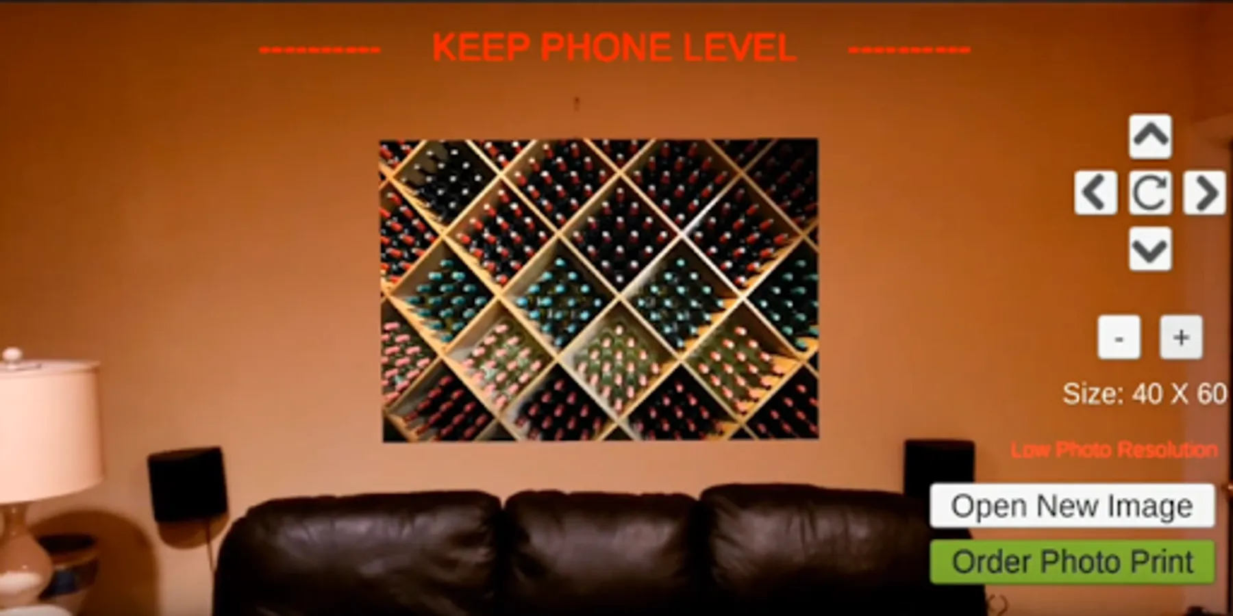 Using the power of Augmented Reality technology, you can now see how any photo in your camera roll will appear in the correct size and aspect ratio on any wall in your home or office.