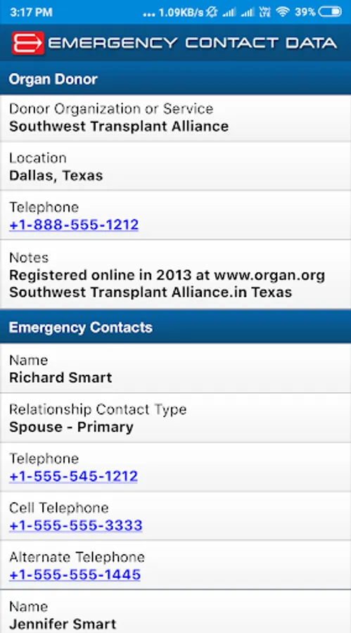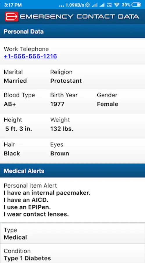 The Emergency Contact Data Profile Viewer displays your critical medical record information that is stored on your device within 5 seconds, worldwide, 24/7, without the Internet. This is the exact information that hospitals and doctors say we need with us at all times. The Profile Viewer can speak for you when you are in shock, confused or unconscious.