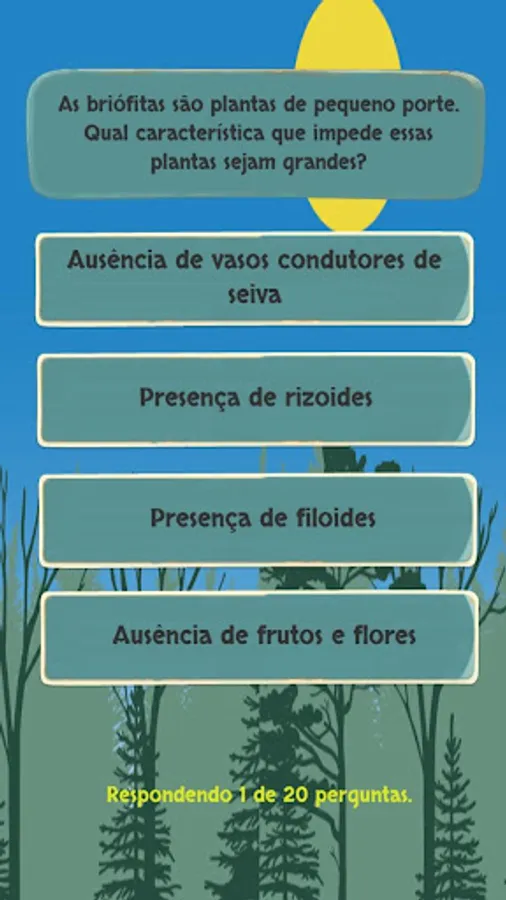 The quiz botanicando Quiz has as objective, through questions of various levels regarding the 4 major areas of botany, which are: Bryophytes, Pteridophytes, Angiosperms and Gymnosperms, to improve more knowledge and increase interest in the area, will encompass all who have interest in learning about botany, including people planning to take the ENEM - National High School Exams, college students, and high school students. In addition, it has original and dynamic visual resources in order to make the knowledge more playful and pleasing to the eye. It also has the objective of attracting diverse publics always seeking to improve the knowledge in this field of Biology. Good luck! Enjoy the game, learning and having fun!