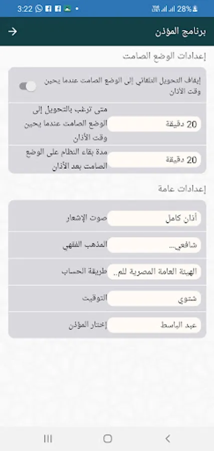 Second: from the settings choose the jurisprudence of Hanafi or Shafie, and the method of calculation, for example the Egyptian General Authority for Survey and the summer time or winter time and the voice of the notice without a voice or ears full