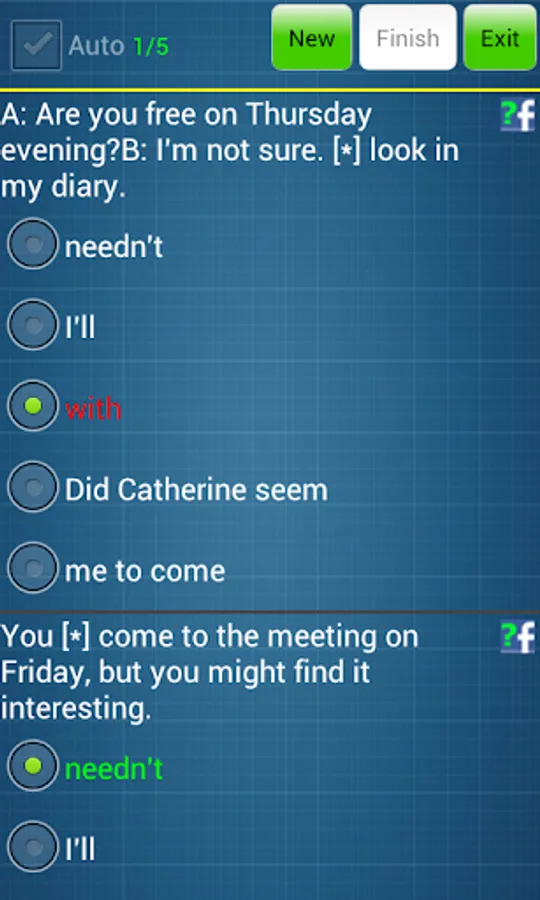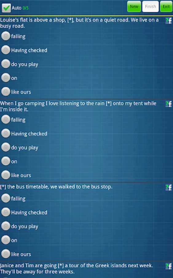 This app contains 1300 English Grammar matching questions. Each test has five questions and there are five answers that the same for each question. You can take the tests in auto-score mode, which marks the correct answer after each question, or test mode, which gives you the answers after you've finished all five questions.