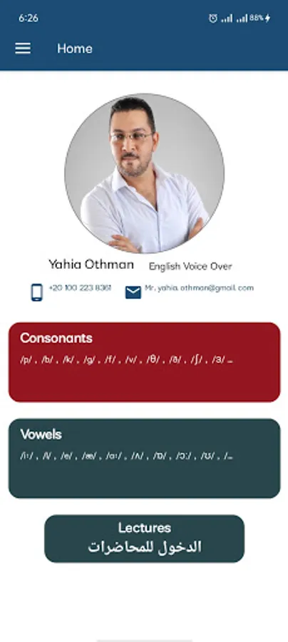 The lecturer is Mr Yahia Othman who is famous for his excellent contribution to the filed of English Phonetics training according to the British and American pronunciation. You can also contact the lecturer, Mr Yahia Othman directly via whatsApp number you will find inside this App to ask him your questions.