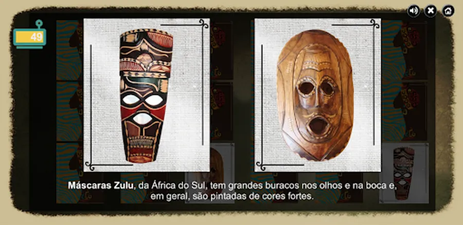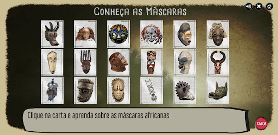 You will get to know masks of different African peoples, their uses and meanings. The game consists of forming pairs of masks from the same people. Attention: they are not identical, but similar. Observe the characteristics of the masks and identify what is common to each pair. During the game you will be challenged to answer three questions. At the end, there is a summary of what you have learned. Good luck!