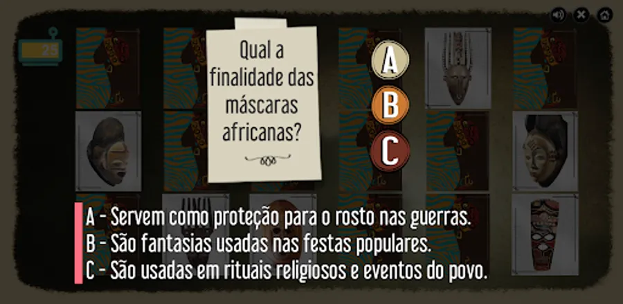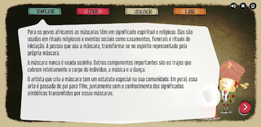 Educational objectives of the game: To know the cultural diversity of African peoples. Characterize the masks by their materials, styles and shapes. Understand masks as identity artifacts of a culture. Understand and differentiate the uses and meanings of African masks.