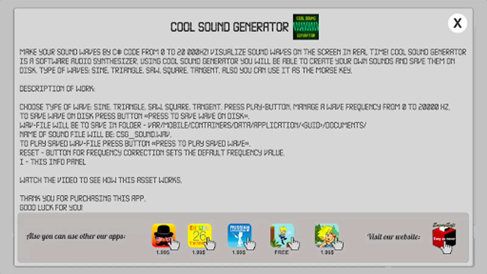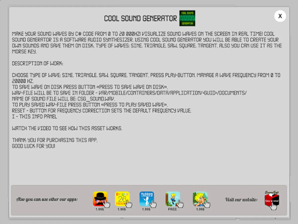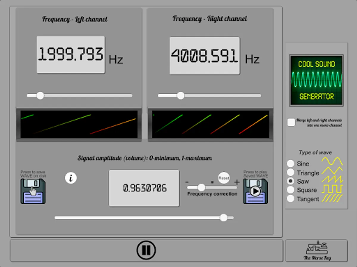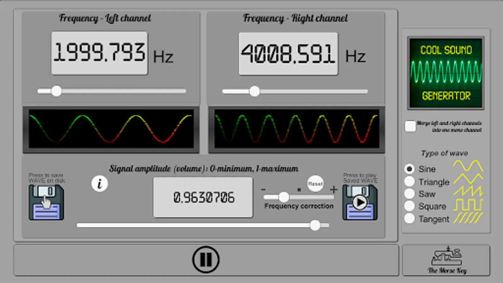 Make your sound waves by C# code from 0 to 20 000Hz! Visualize sound waves on the screen in real time! Cool Sound Generator is a software audio synthesizer. Using Cool Sound Generator you will be able to create your own sounds and save them on disk. Type of waves: sine, triangle, saw, square, tangent. Also you can use it as the Morse key.