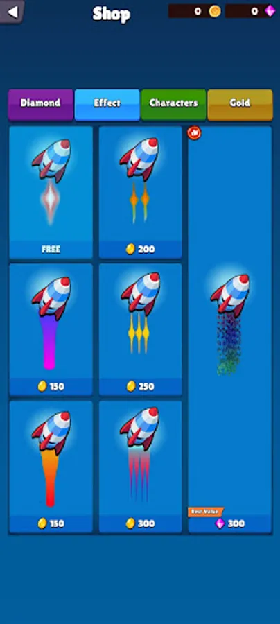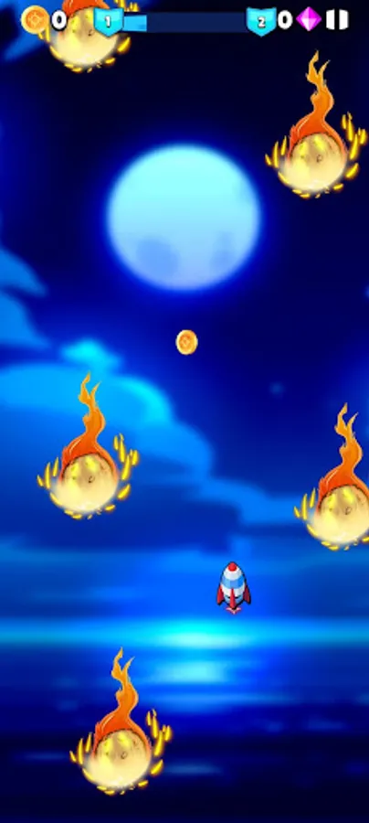 You are a rocket and space are waiting you. Escape the METEORS and collect the golds and the diamonds. You can buy new rockets and new effects with gold or diamond. ENDLESS fun is waiting you.