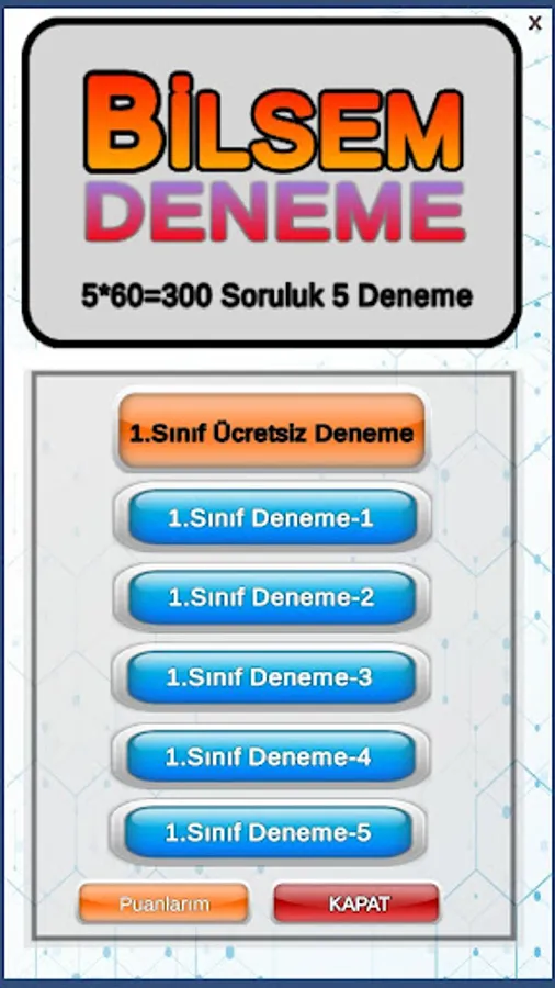 The original questions prepared after examining all the local and foreign sources were transformed into a mobile trial application according to the 1st grade level. It is aimed that the students make an experiment suitable for the real exam. Works on Android mobile phones and Tablets.