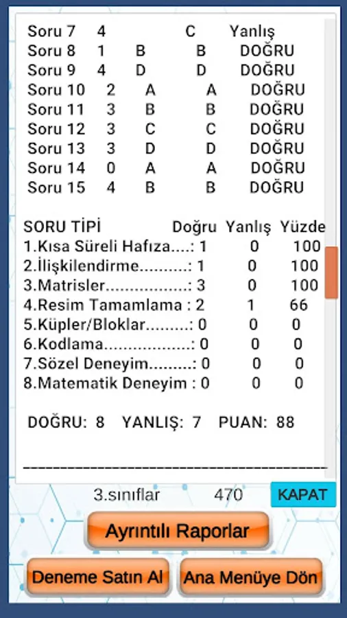 - DETAILED REPORT. Right and wrong numbers and rates according to the question types. Thus, the student will be able to see which question types are weak.
