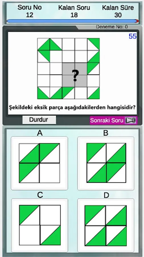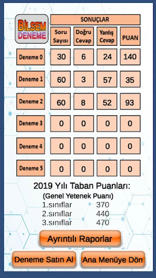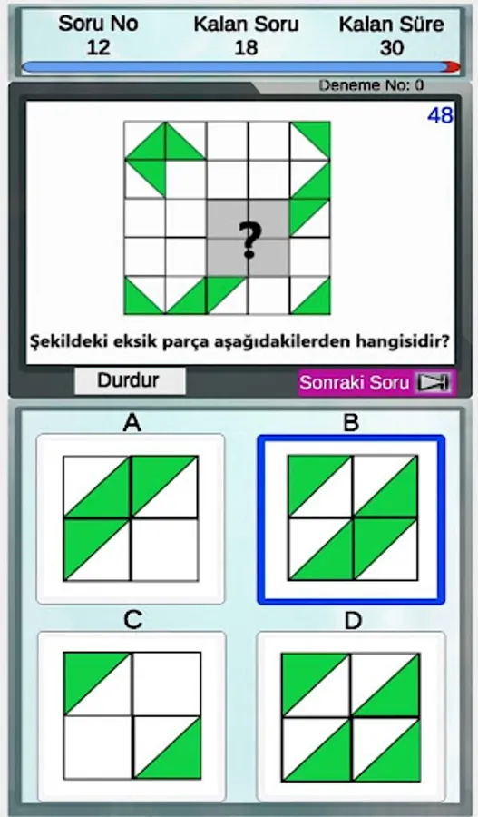 In MEB Bilsem Group Screening Test application, it is carried out on TABLET devices with 60 questions in 1st, 70th, and 3rd and 3rd grades. Questions are questions aimed at measuring reasoning skills in visuals that do not require verbal or numerical processing in the first year. Some questions in the 2nd and 3rd grades require Verbal and Numerical skills.