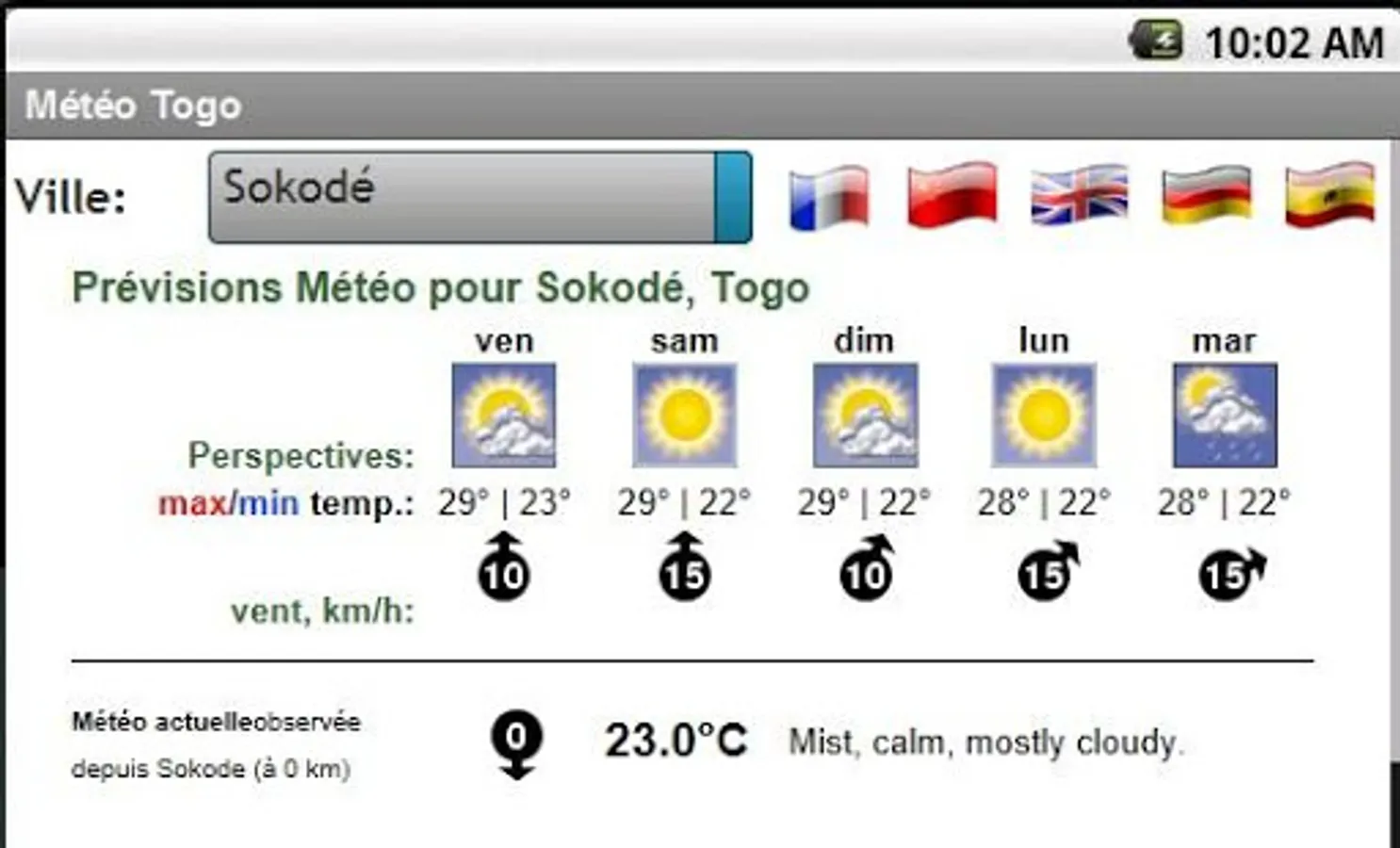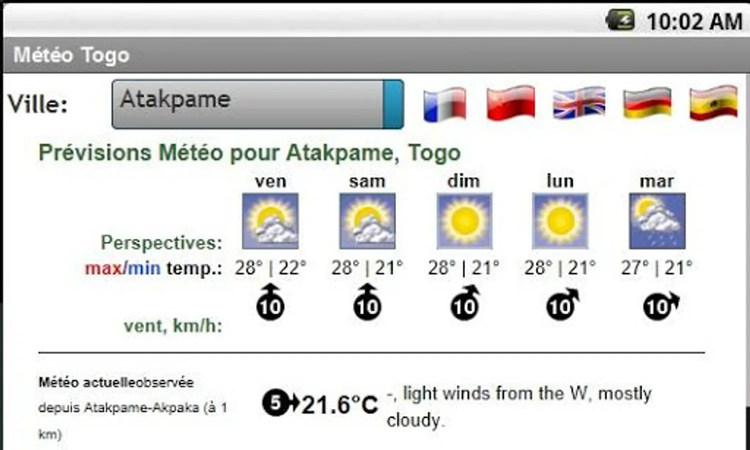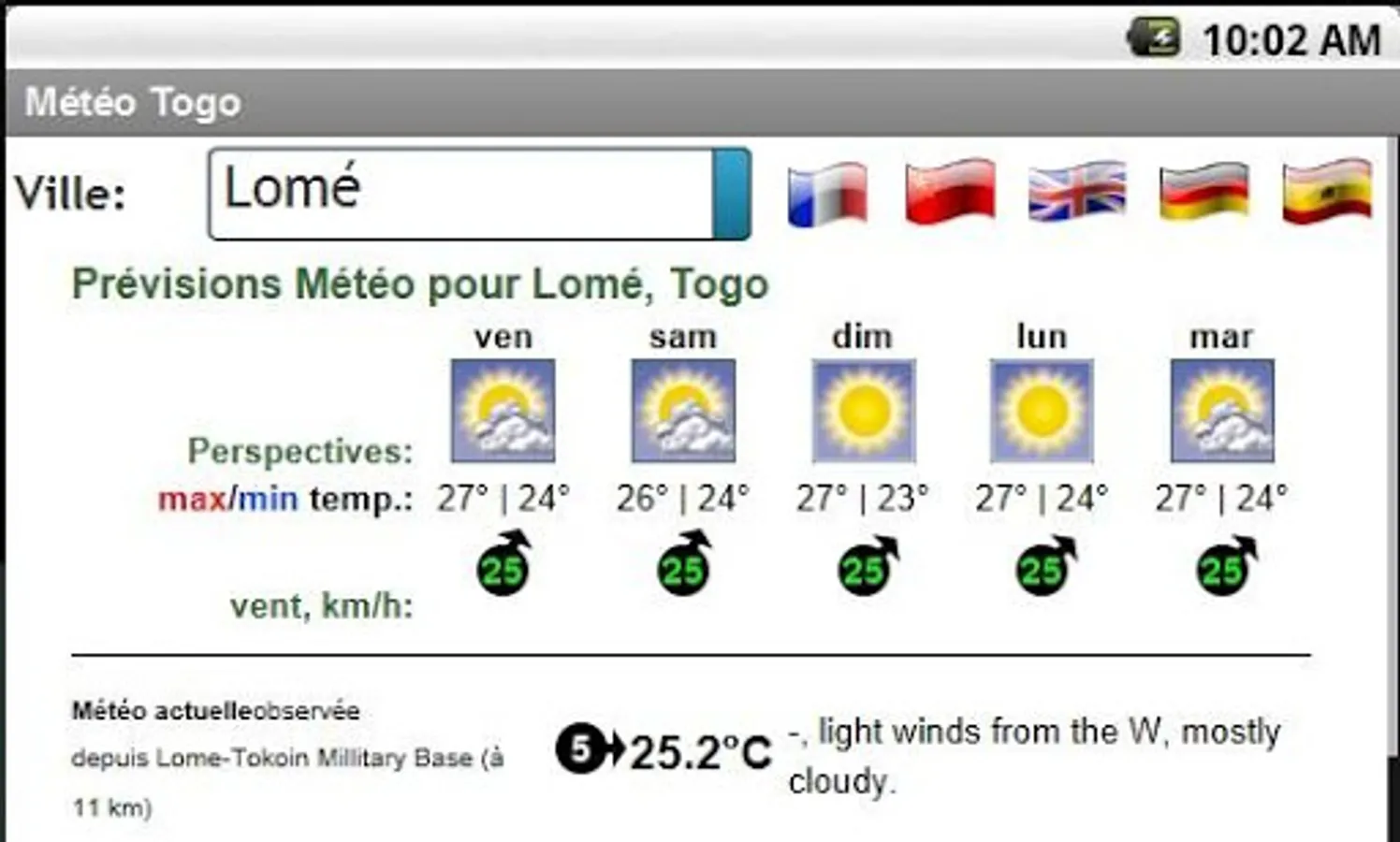 Five (5) days weather forecast for all cities in Togo. Perspectives, Min and Max temperatures, wind speeds and directions, cloud cover, etc.