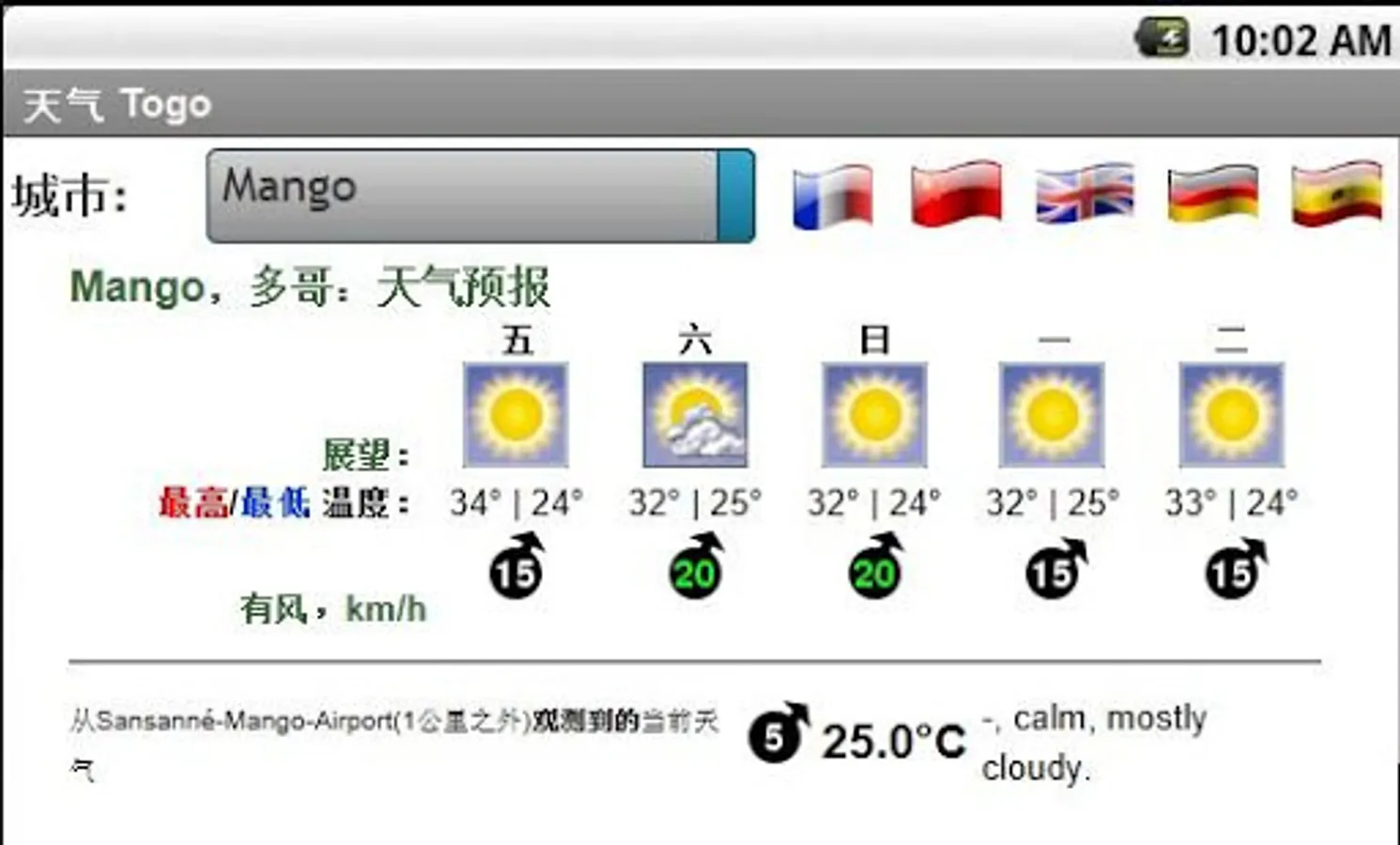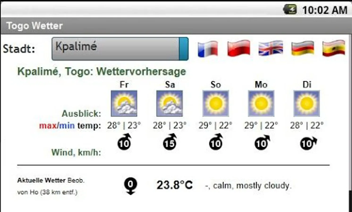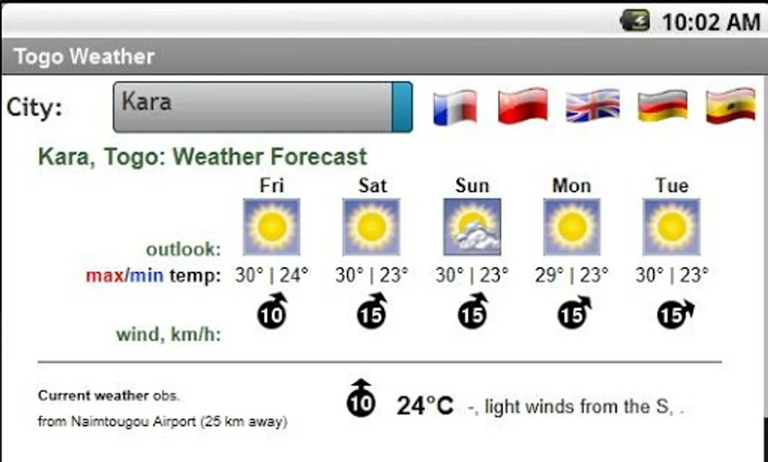 Five (5) days weather forecast for all cities in Togo. Perspectives, Min and Max temperatures, wind speeds and directions, cloud cover, etc.