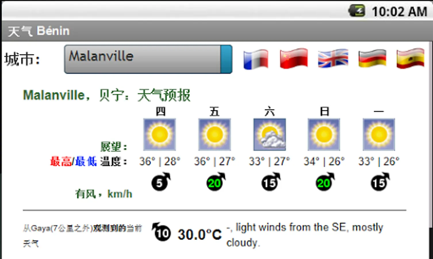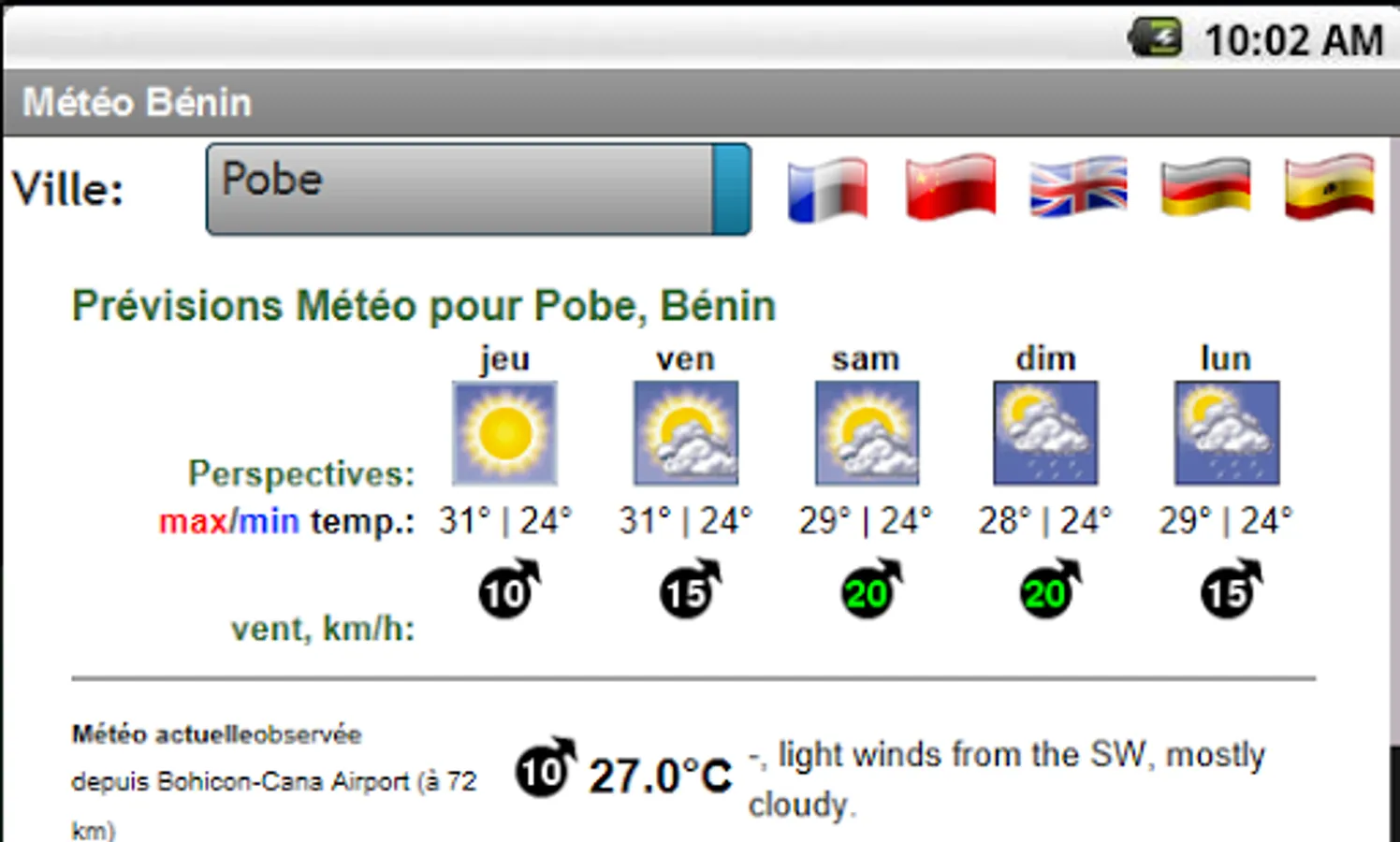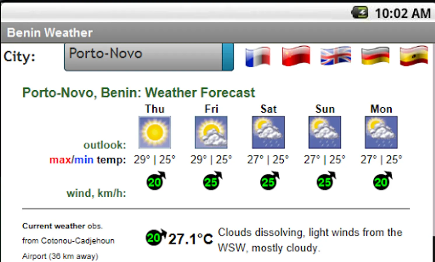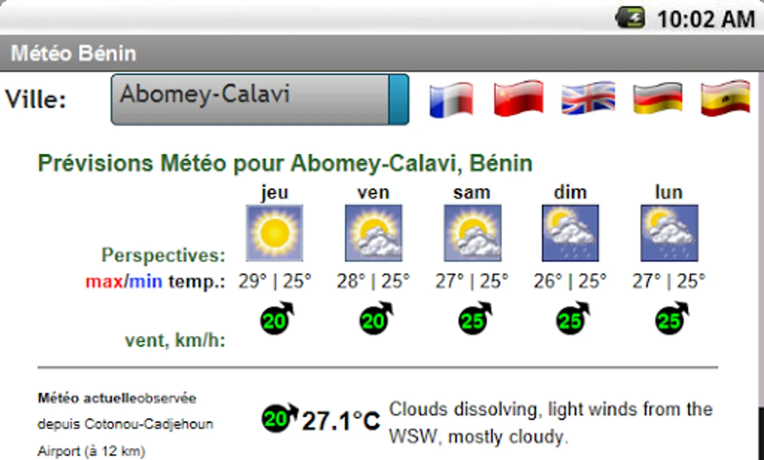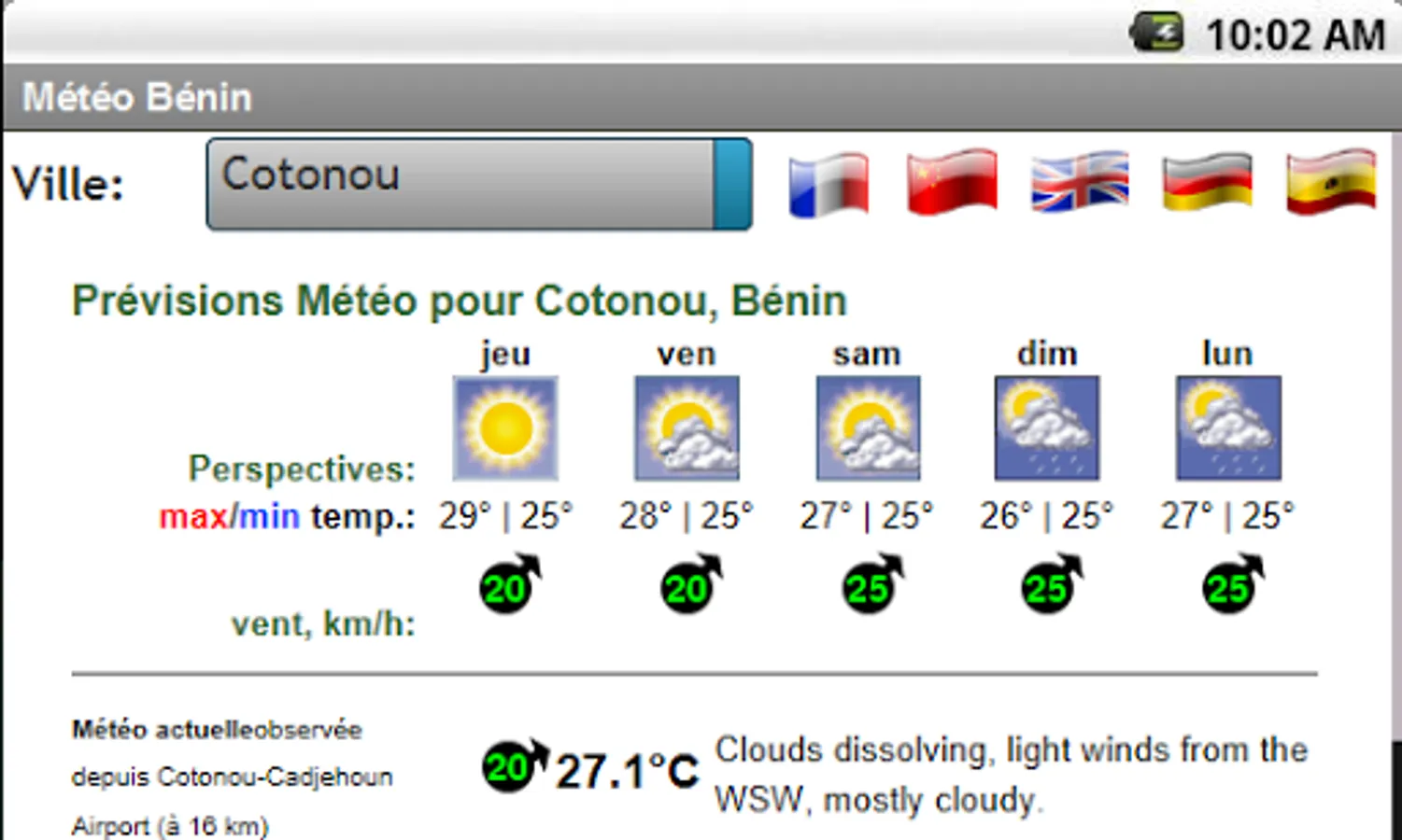 Five (5) day weather forecast for all cities in Benin. Perspectives, Min and Max temperatures, wind speeds and directions, cloud cover, etc.
