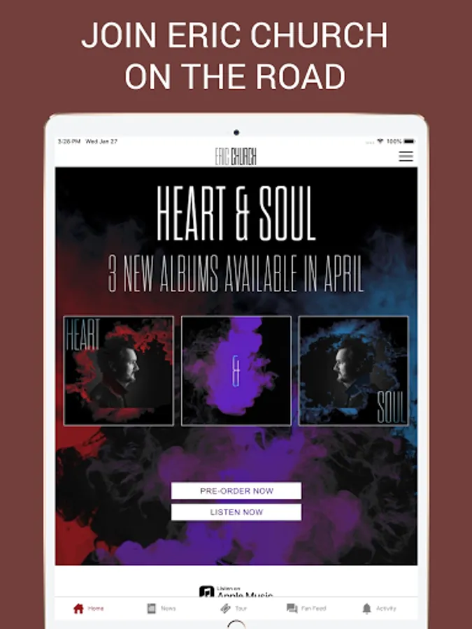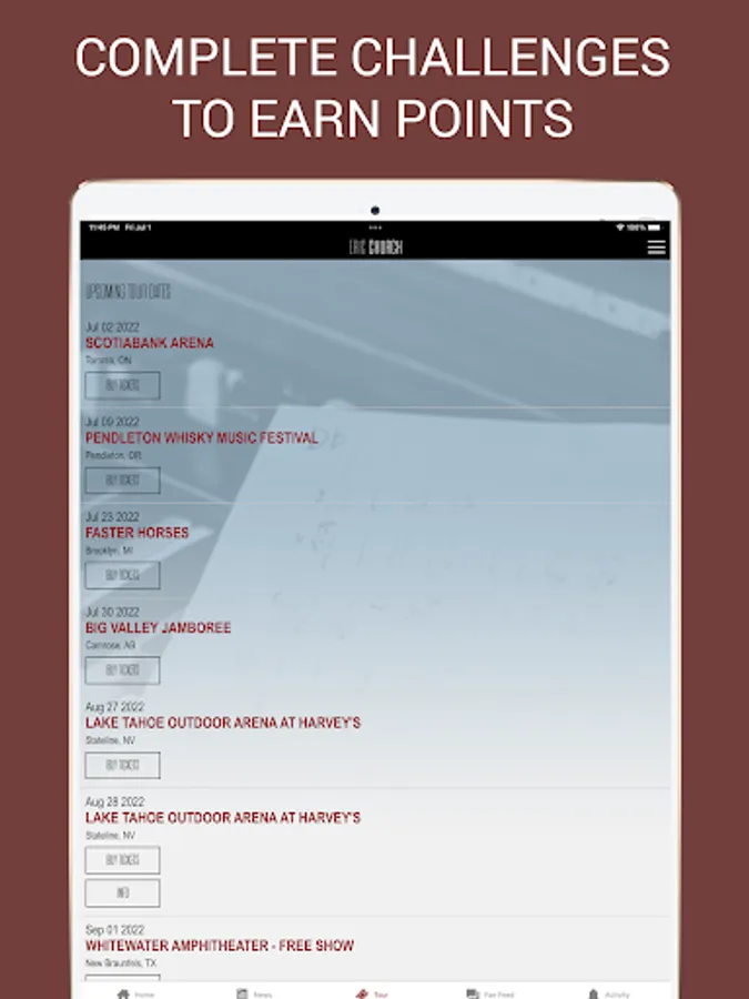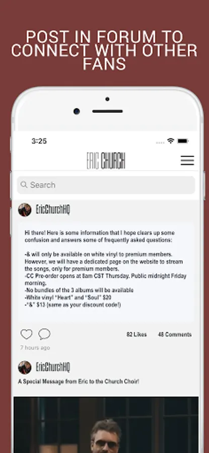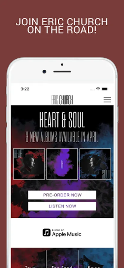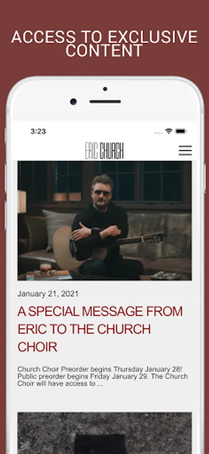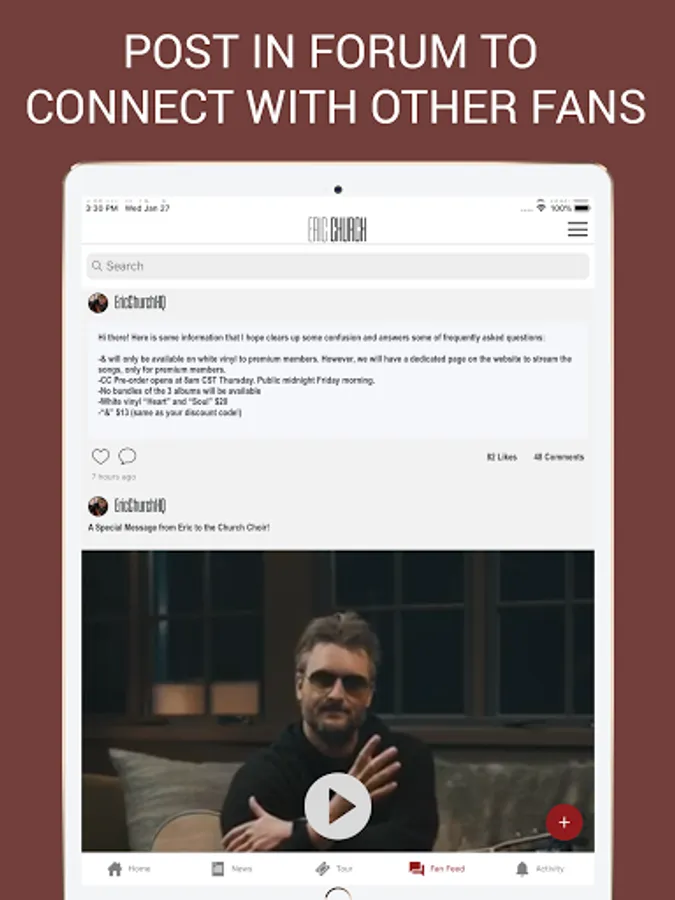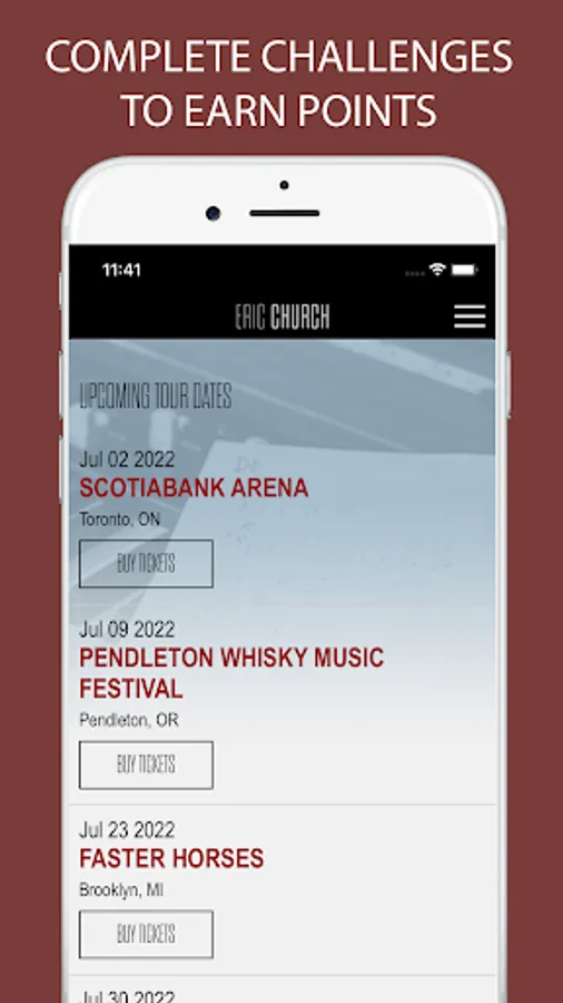 Welcome to the Eric Church App - the community for fans to connect with each other and enhance their experience all year round! Gain exclusive access to photos, videos, and BTS content as Eric travels across the country on tour - and more!