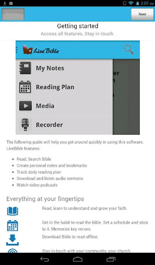 º LiveBible stores your browsing history on SD card. SD card is required for offline mode.
